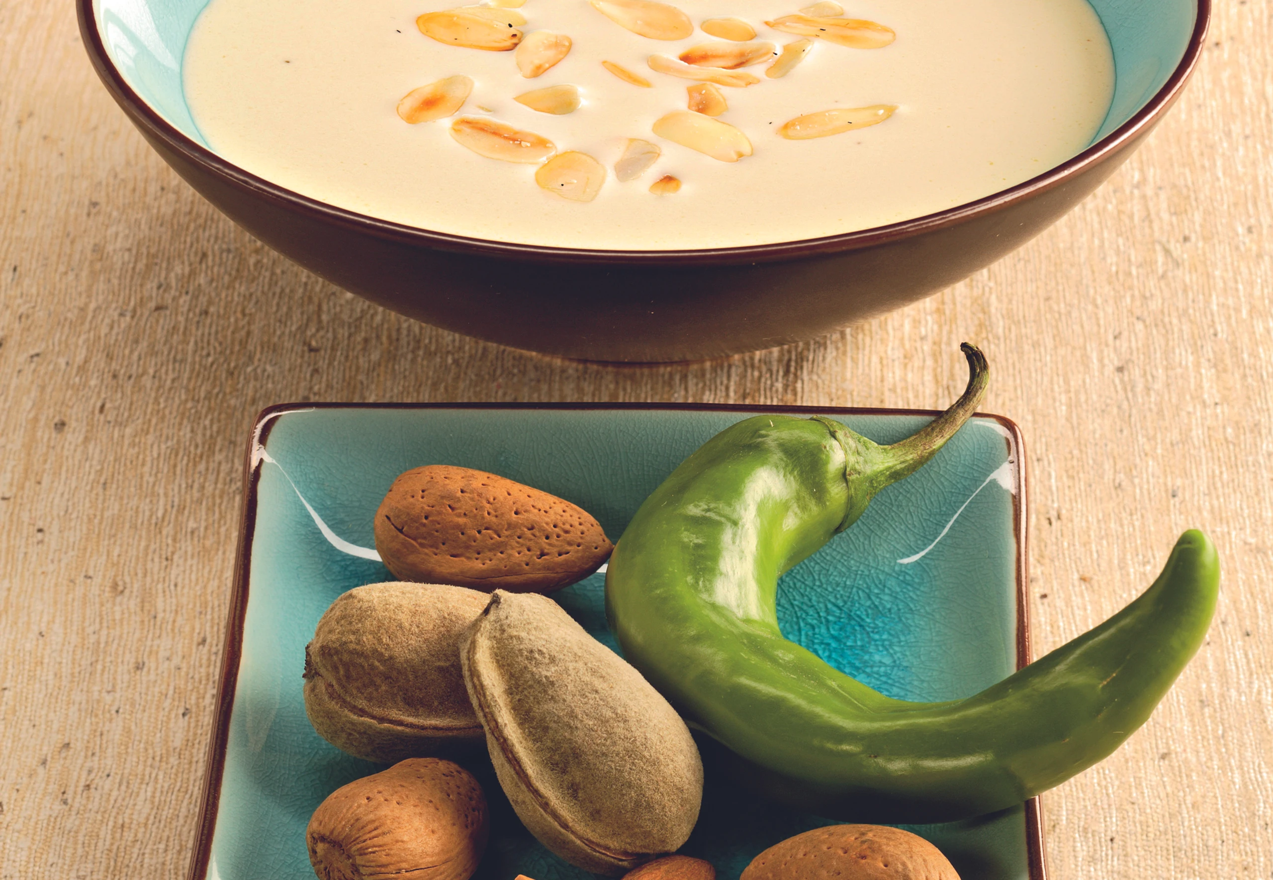 Mandelblättchen in einer Pfanne ohne Fett bei mittlerer Hitze goldgelb rösten, dabei die Pfanne ständig bewegen. Suppe vor dem Anrichten gut aufrühren, in Schalen füllen, mit Mandelblättchen und klein geschnittenem Chili bestreuen.