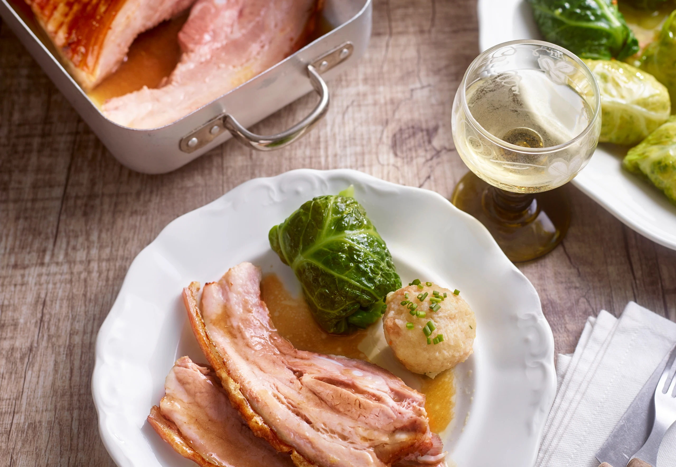 Kümmelbraten mit Kohlpäckchen und Grießknödel