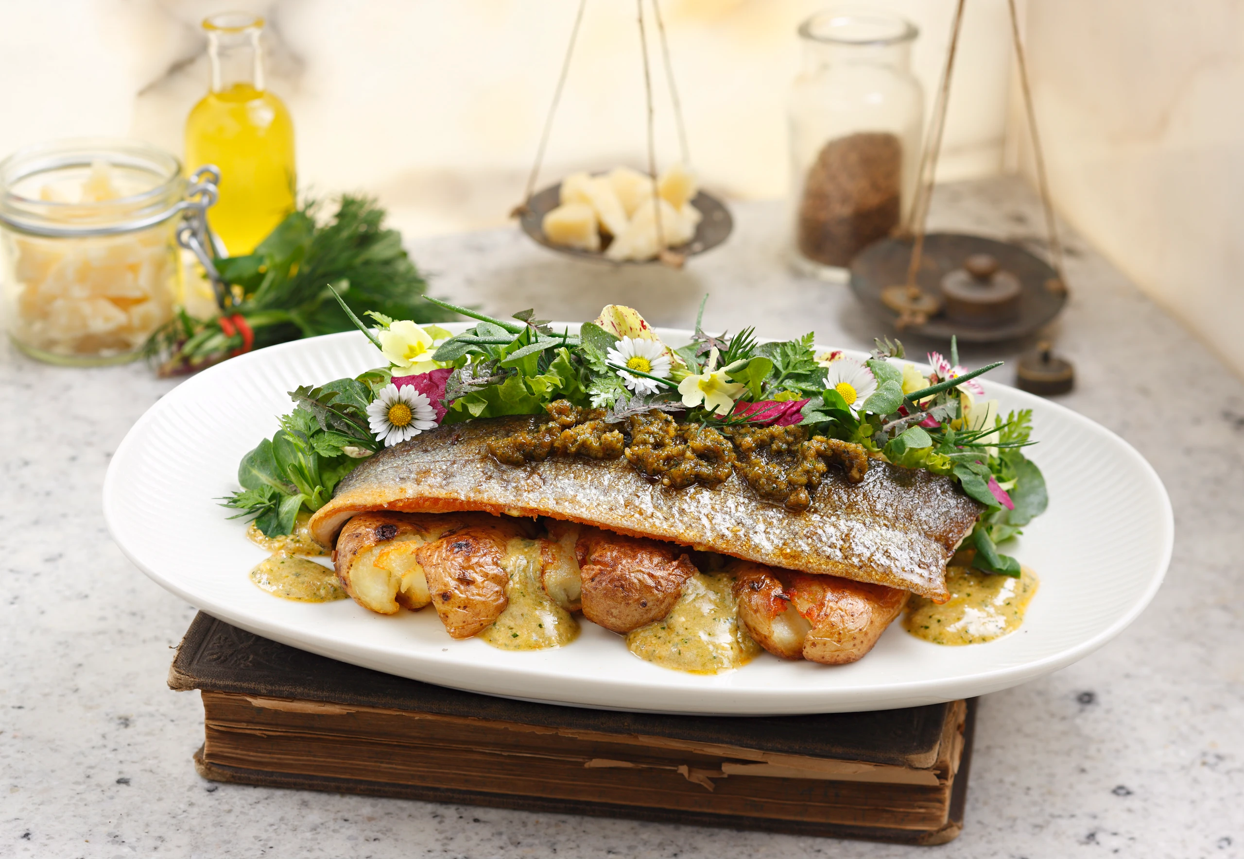 Filets herausnehmen, die Hälfte des restlichen Pestos in der Pfanne erwärmen und mit dem Schneebesen aufschlagen. Erdäpfel mit dem aufgeschlagenen Pesto anrichten, Filets darauflegen, mit übrigem Pesto und Frühlingskräutersalat servieren.