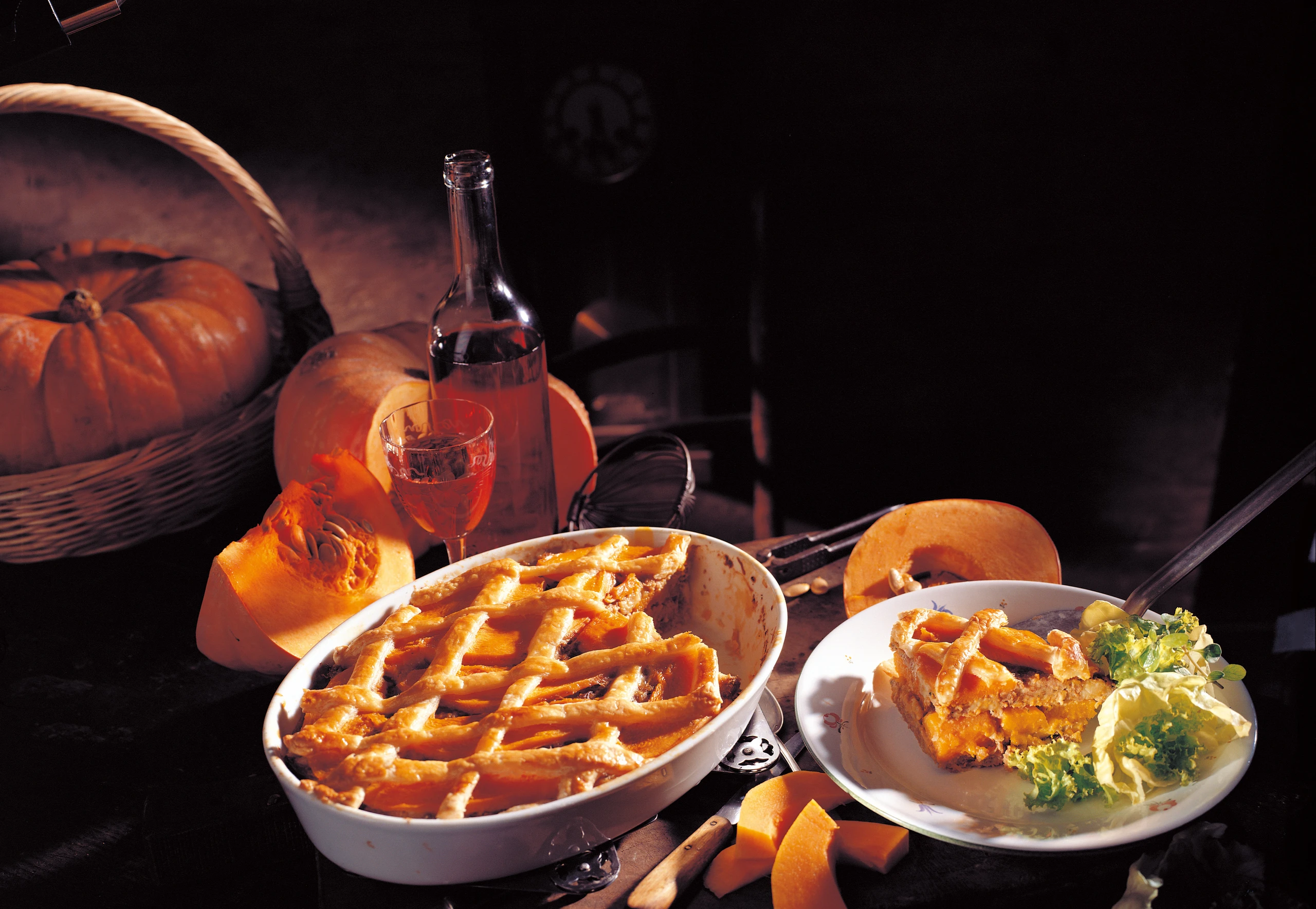 Faschiertes und Kürbisscheiben abwechselnd in die Form schichten, dabei jede Lage mit geriebenem Käse bestreuen. Die oberste Schicht ist Kürbis. Teigstreifen dekorativ darauflegen und mit verquirltem Ei bestreichen. Auflauf im vorgeheizten Rohr (mittlere Schiene/Gitterrost) ca. 1 Stunde backen. Als Beilage passt Salat.