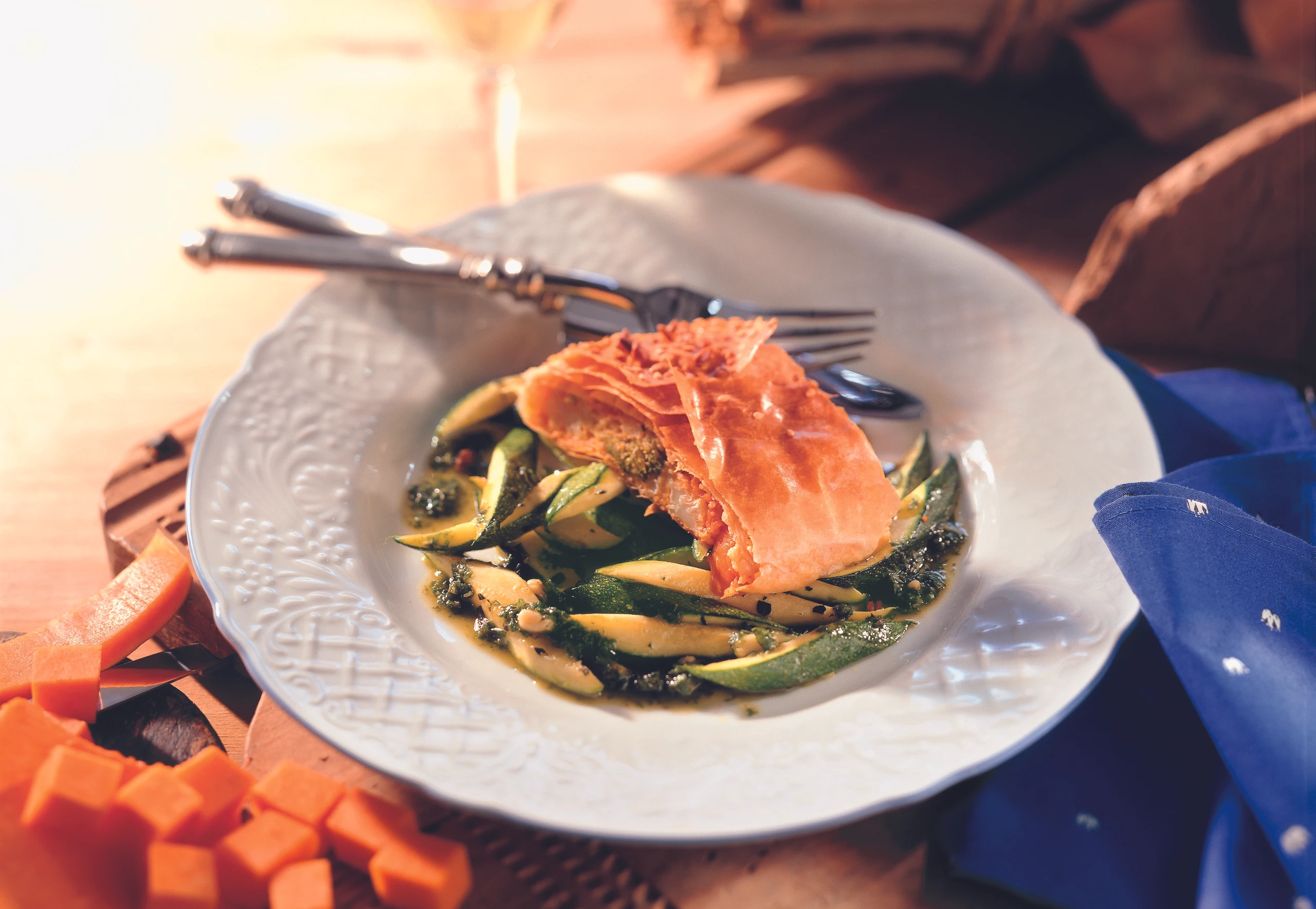 Kürbis-Gemüsestrudel mit Pesto-Zucchini