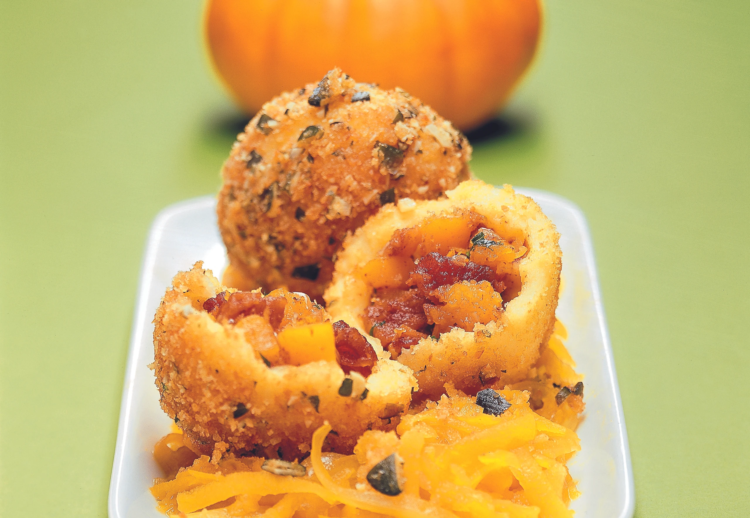 Kürbis in 1 cm große, Zwiebel in kleine Würfel schneiden. Zwiebel und Kürbis in Grammelschmalz anschwitzen. Knoblauch und Grammeln zugeben, Petersilie untermischen, salzen und pfeffern. Masse abkühlen lassen. Aus der Fülle 8 Kugeln formen und kurz in den Tiefkühler geben.