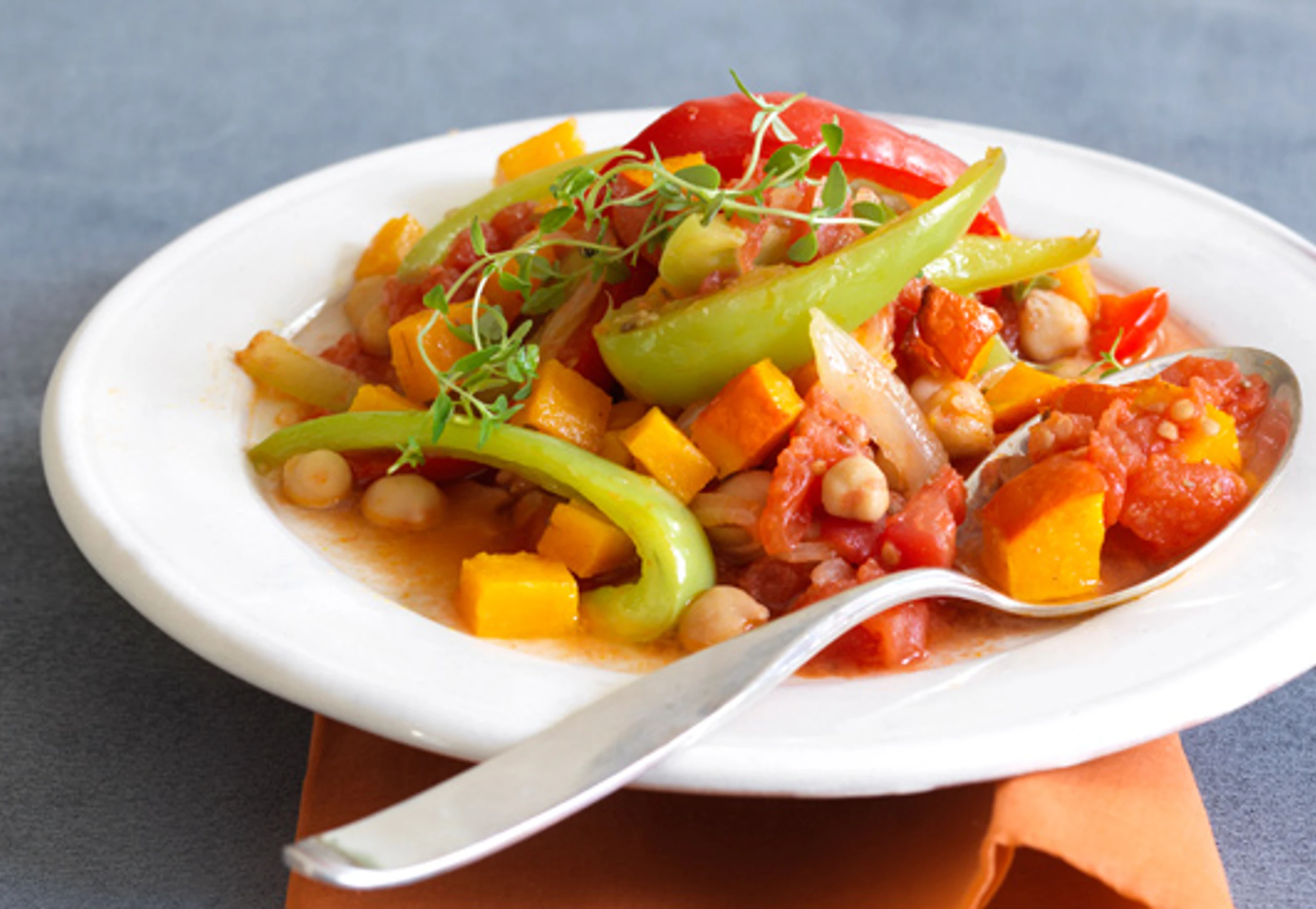 Kichererbsen und Paradeiser zur Paprikamischung geben, kurz köcheln. Gemüse mit Salz und Pfeffer würzen, mit Kürbiswürfeln bestreut servieren. Dazu schmeckt Fladenbrot.