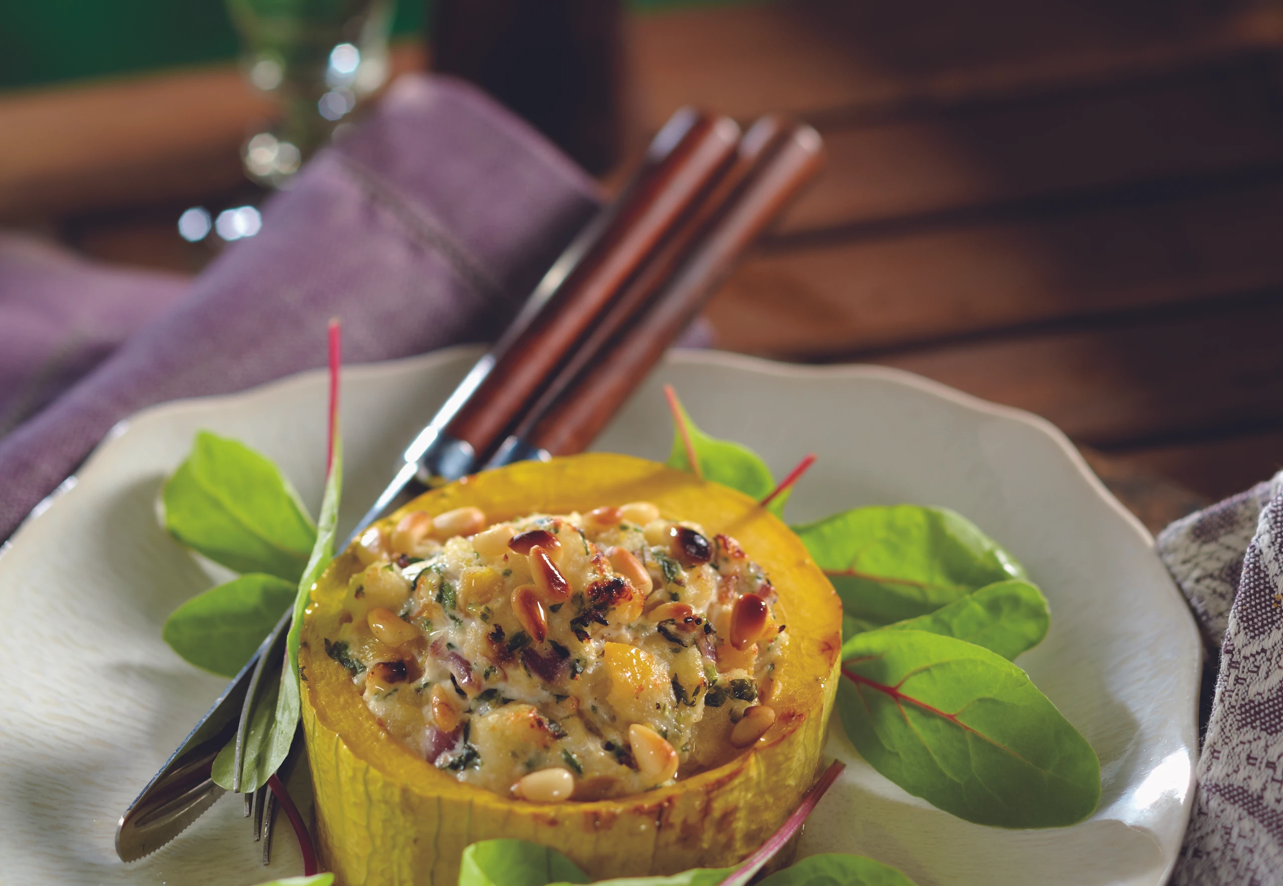 Parmesan reiben und zusammen mit dem Topfen unter die Kürbismasse heben. Topfen-Kürbismasse in die gebratenen Kürbisscheiben füllen und mit Pignoli bestreuen. Kürbis im Rohr (mittlere Schiene) goldbraun überbacken (ca. 15 Minuten). Kürbis mit Mangoldblättern servieren.