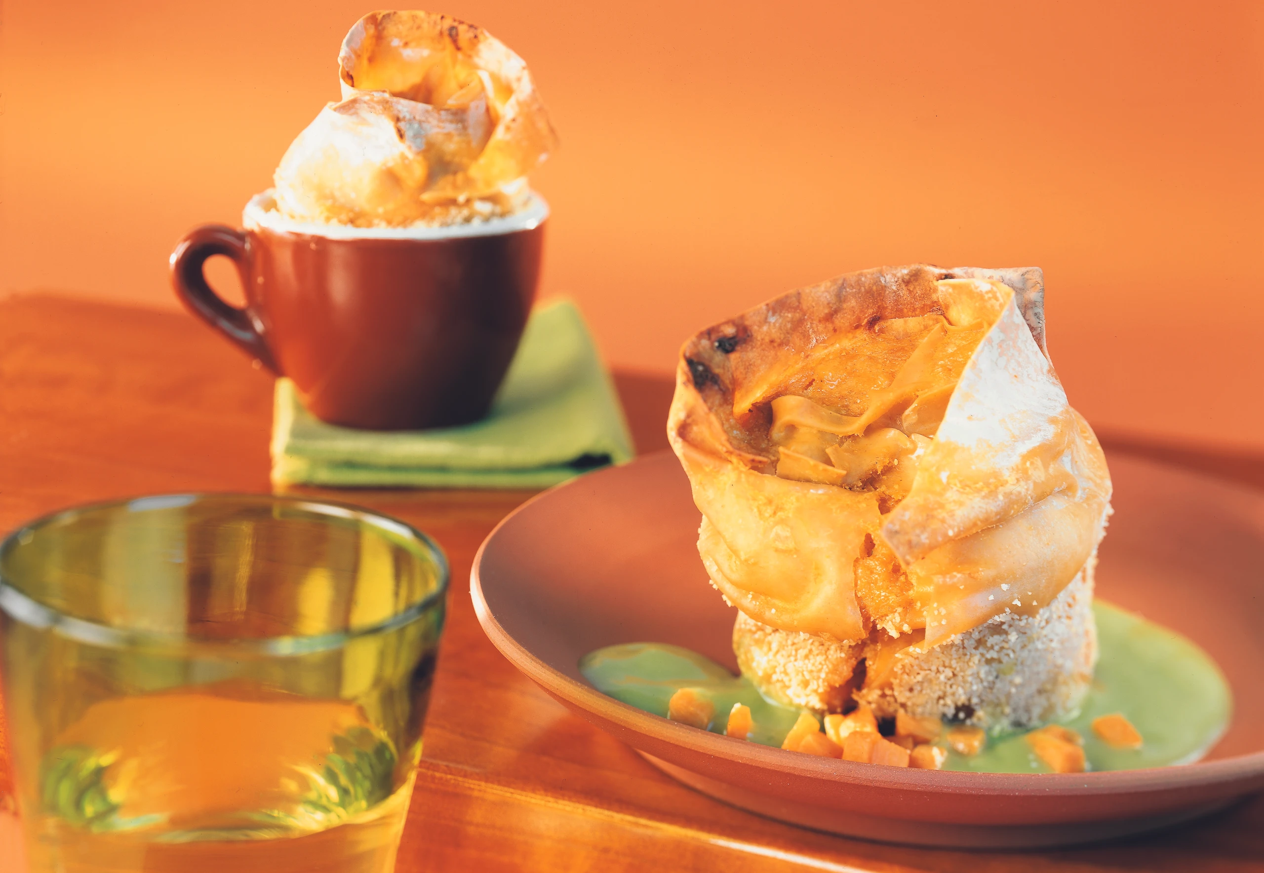 Teigstreifen ca. 1 cm dick mit Fülle bestreichen, dabei rundum einen ca. 1 cm breiten Rand frei lassen. Streifen einrollen und in die Förmchen setzen. Förmchen in das Wasserbad stellen und die Rouladen ca. 30 Minuten im Rohr backen.