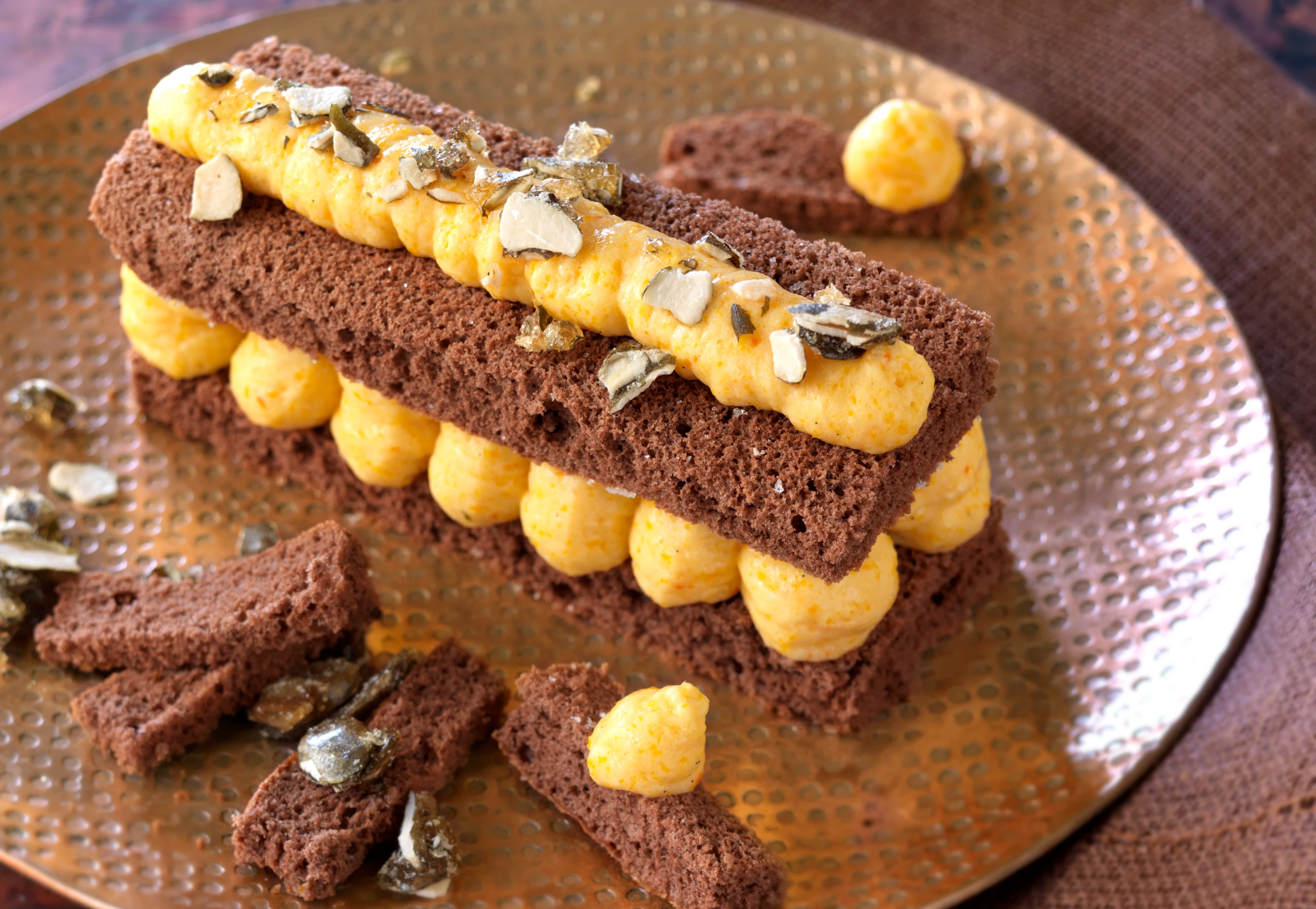 Für die Creme Kerne vom Kürbis entfernen. Kürbis raspeln, mit 50 g vom Zucker, Ingwer und Orangensaft ca. 15 Minuten köcheln. Kürbis abseihen, abtropfen lassen und pürieren. Püree durch ein Sieb streichen und auskühlen lassen.