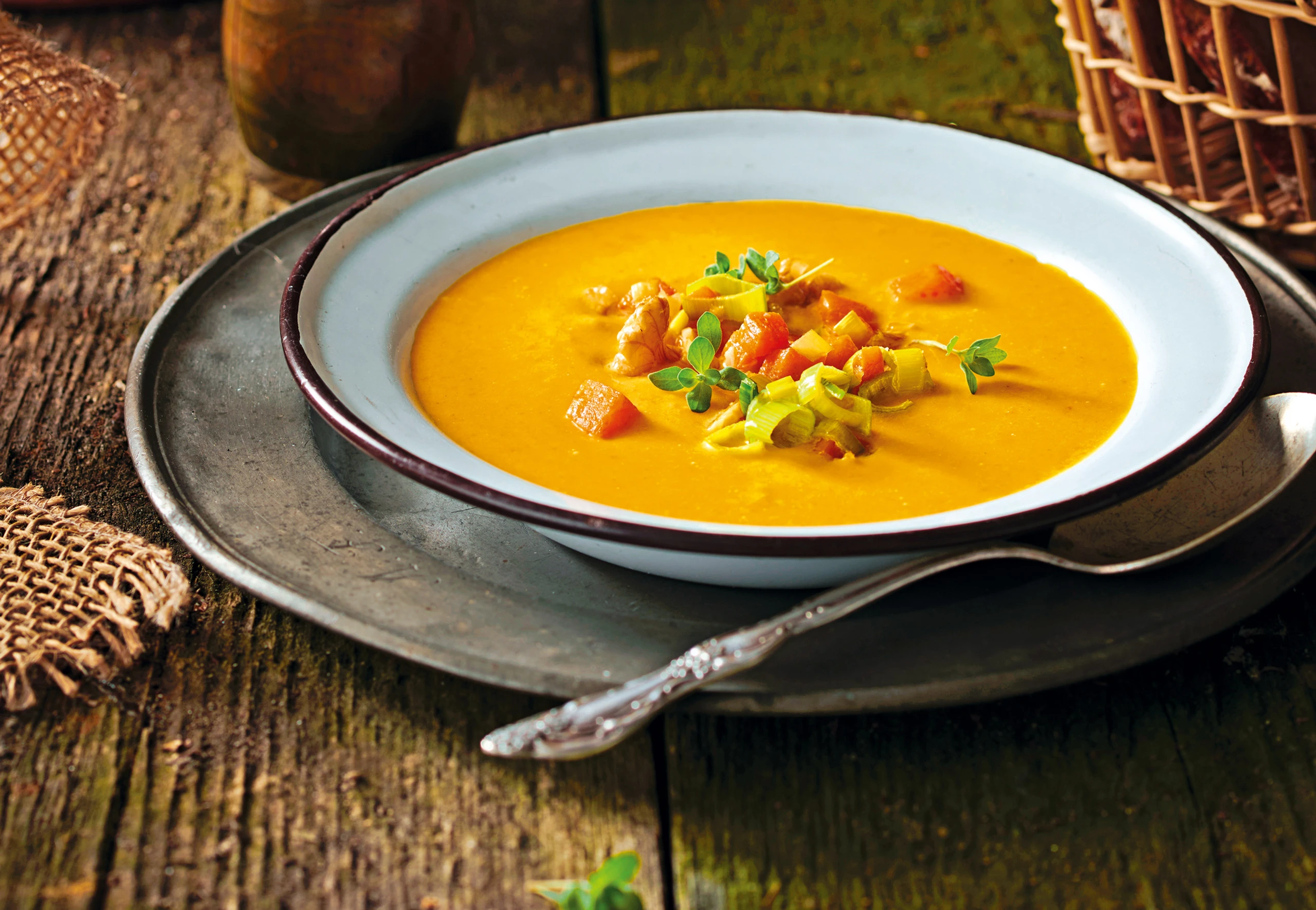 Kürbis entkernen. Zwiebeln und Kürbis schälen und in ca. 1 cm große Stücke schneiden. 100 g vom Kürbis für die Einlage beiseite legen. Zwiebeln und übrigen Kürbis in Butter anschwitzen, Curry einrühren, mit Orangensaft und Suppe aufgießen. Suppe mit Salz, Pfeffer und Knoblauch würzen und ca. 20 Minuten köcheln.