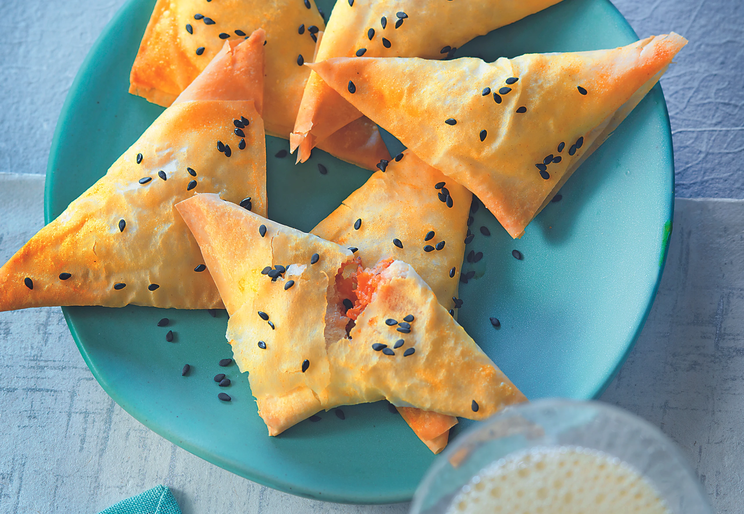 Pastetchen auf das Blech legen. Übrige Teigblätter und Fülle ebenso verarbeiten. 2 EL Öl und ¼ TL Kurkuma verrühren. Pastetchen damit bestreichen, mit Sesam bestreuen, im Rohr (mittlere Schiene) goldgelb backen (ca. 12 Minuten). Pastetchen lauwarm oder kalt servieren.