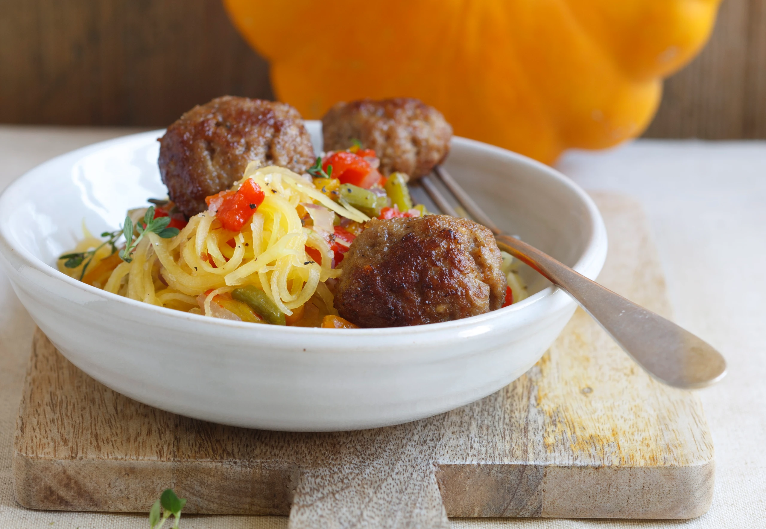 Zwiebel und Knoblauch schälen, Thymianblättchen abzupfen. Zwiebel fein hacken, Knoblauch dünnblättrig schneiden, beides in Olivenöl kurz andünsten, Paprika und Thymian zugeben, kurz rösten. Kürbis-Spaghetti untermischen, mit Salz und Pfeffer würzen, mit den Kalbsbällchen anrichten.