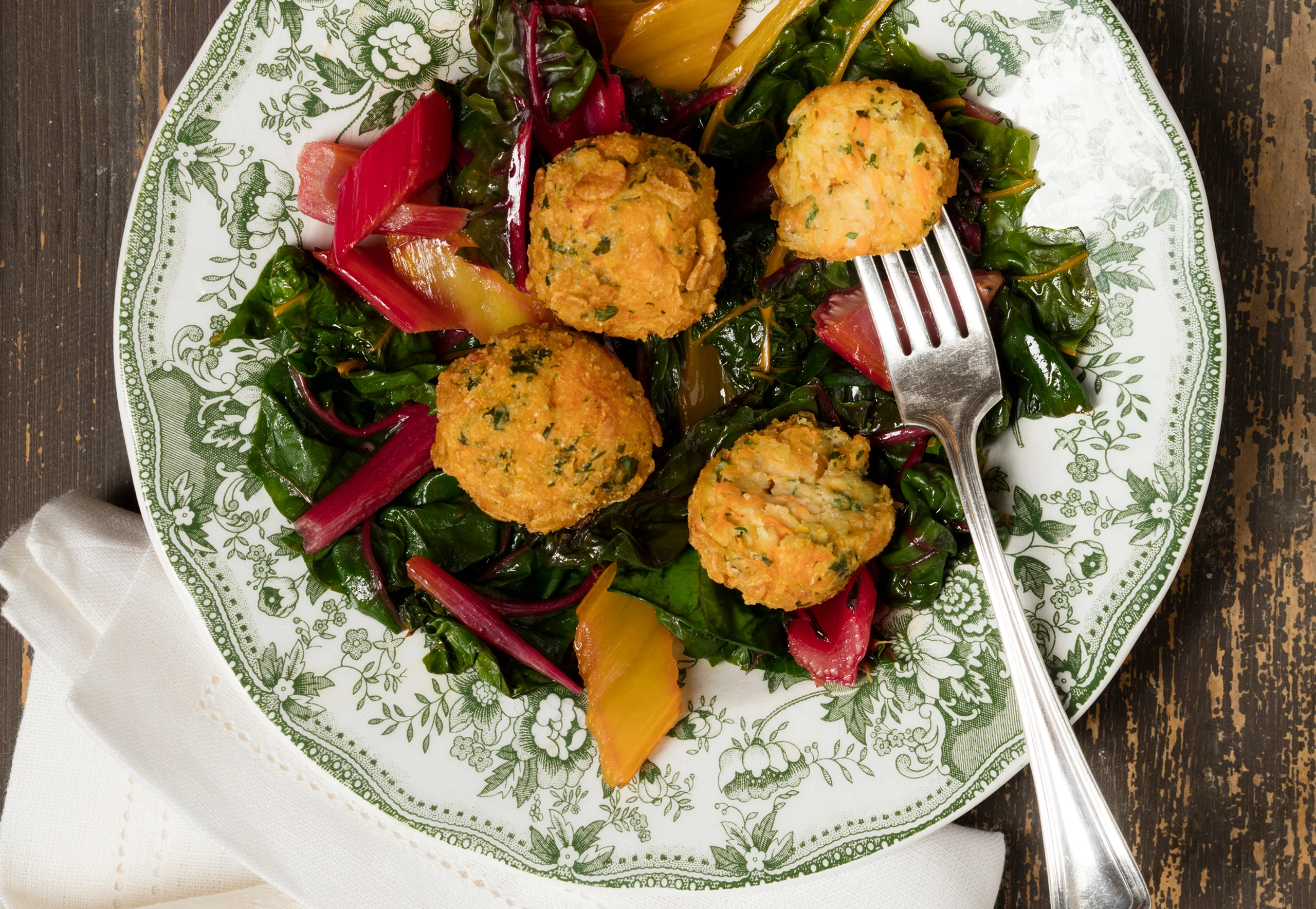 Aus der Kürbismasse 12 Bällchen formen und rundum in den Cornflakes wälzen. 3 Finger hoch Öl erhitzen, Bällchen darin knusprig backen. Herausheben, abtropfen lassen und mit dem Mangold anrichten.