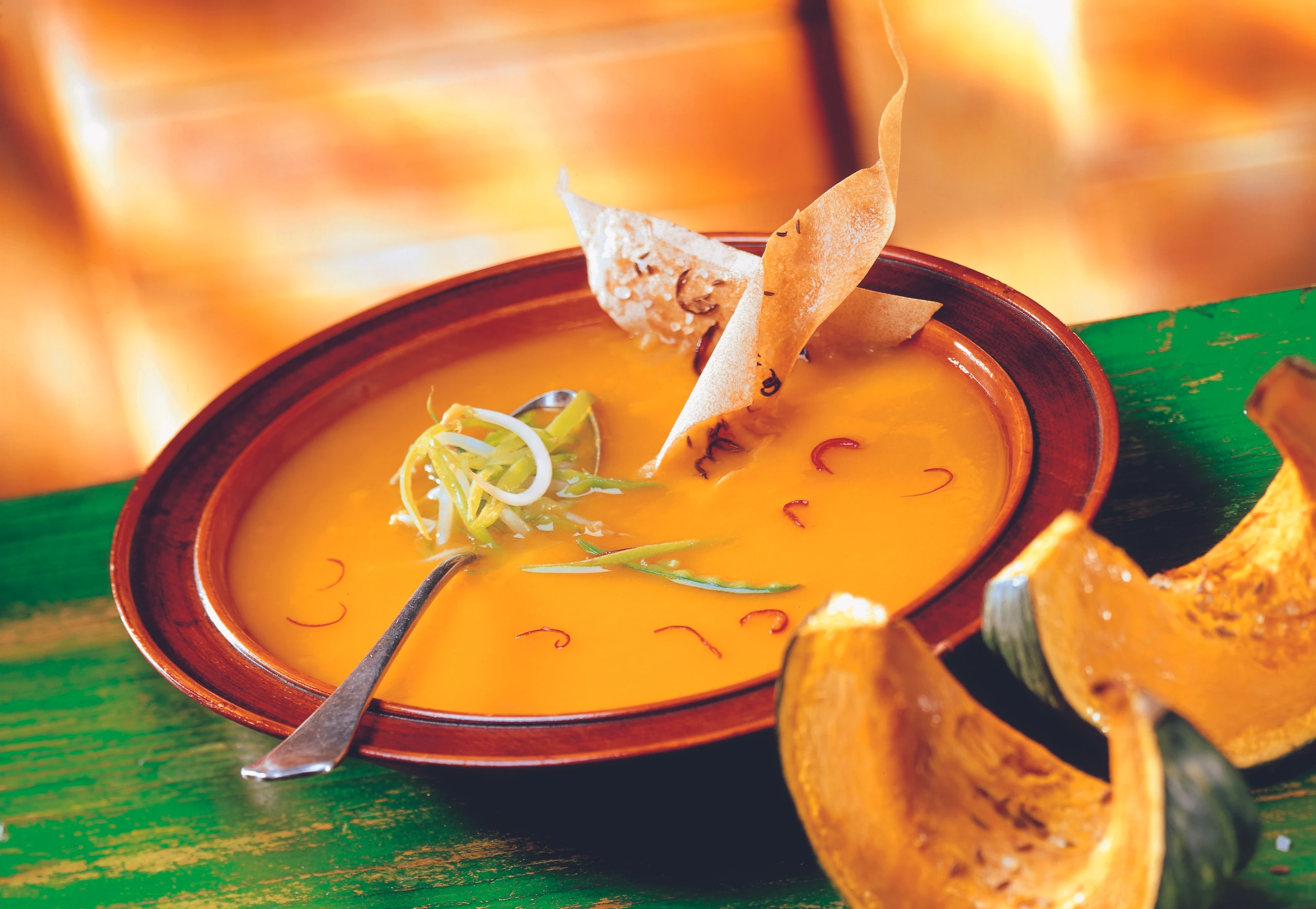 Für die Garnitur Chili in feine Ringe schneiden. Strudelblatt in Dreiecke schneiden, auf ein mit Backpapier belegtes Blech legen, mit Butter bestreichen, mit Kümmel, Meersalz und Chilistreifen bestreuen und im Rohr (180 °C) goldbraun backen.