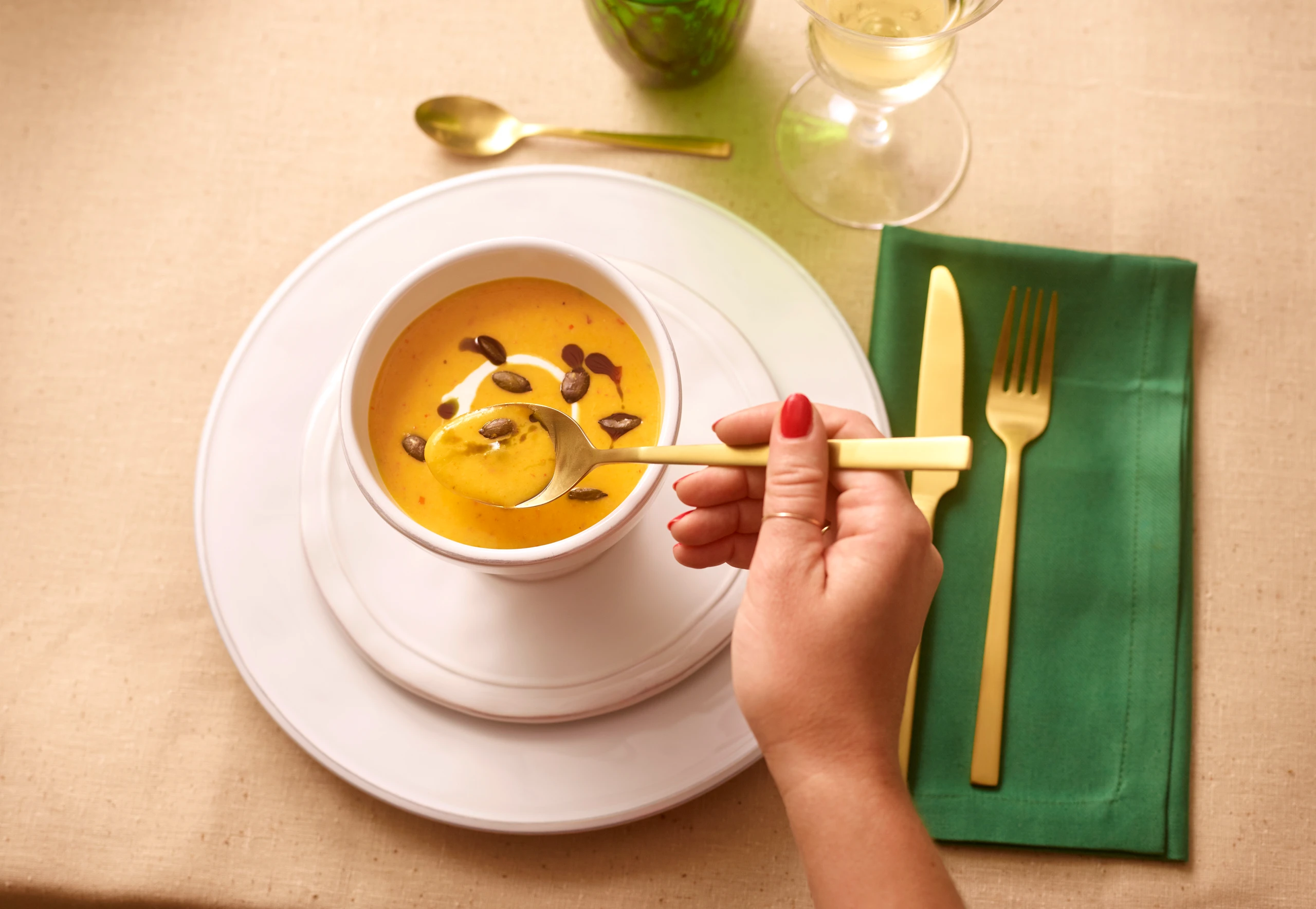 Kürbiscremesuppe mit Sauerrahm, Kernöl und Kürbiskernen