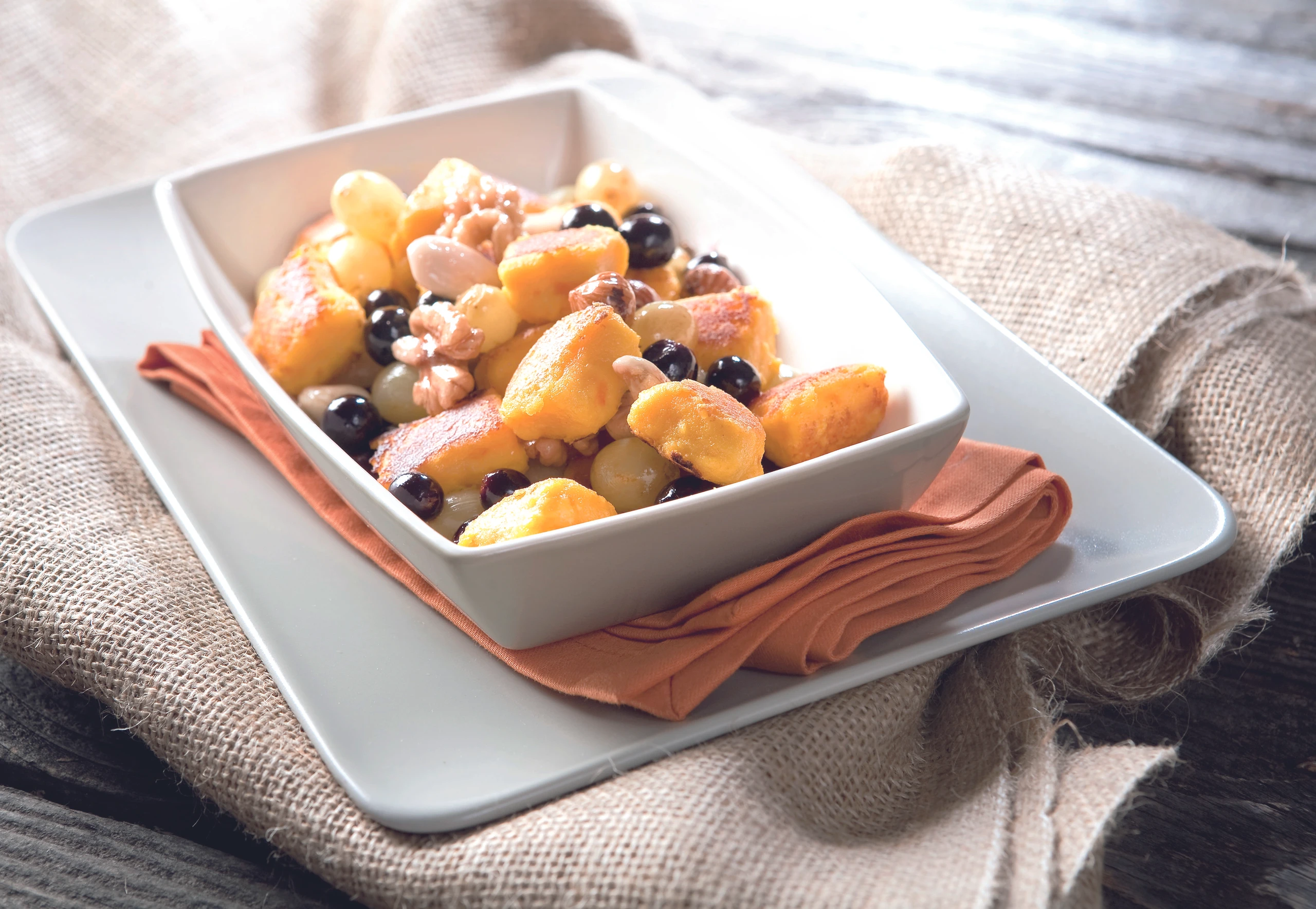 - Für das Ragout Honig in einer Pfanne erhitzen, mit Wein ablöschen, Trauben und Nüsse darin schwenken. Mit wenig Zimt abschmecken. Gnocchi mit dem Ragout anrichten.
