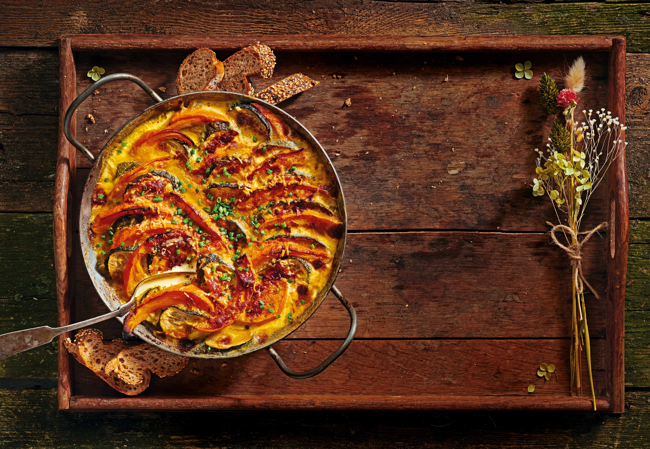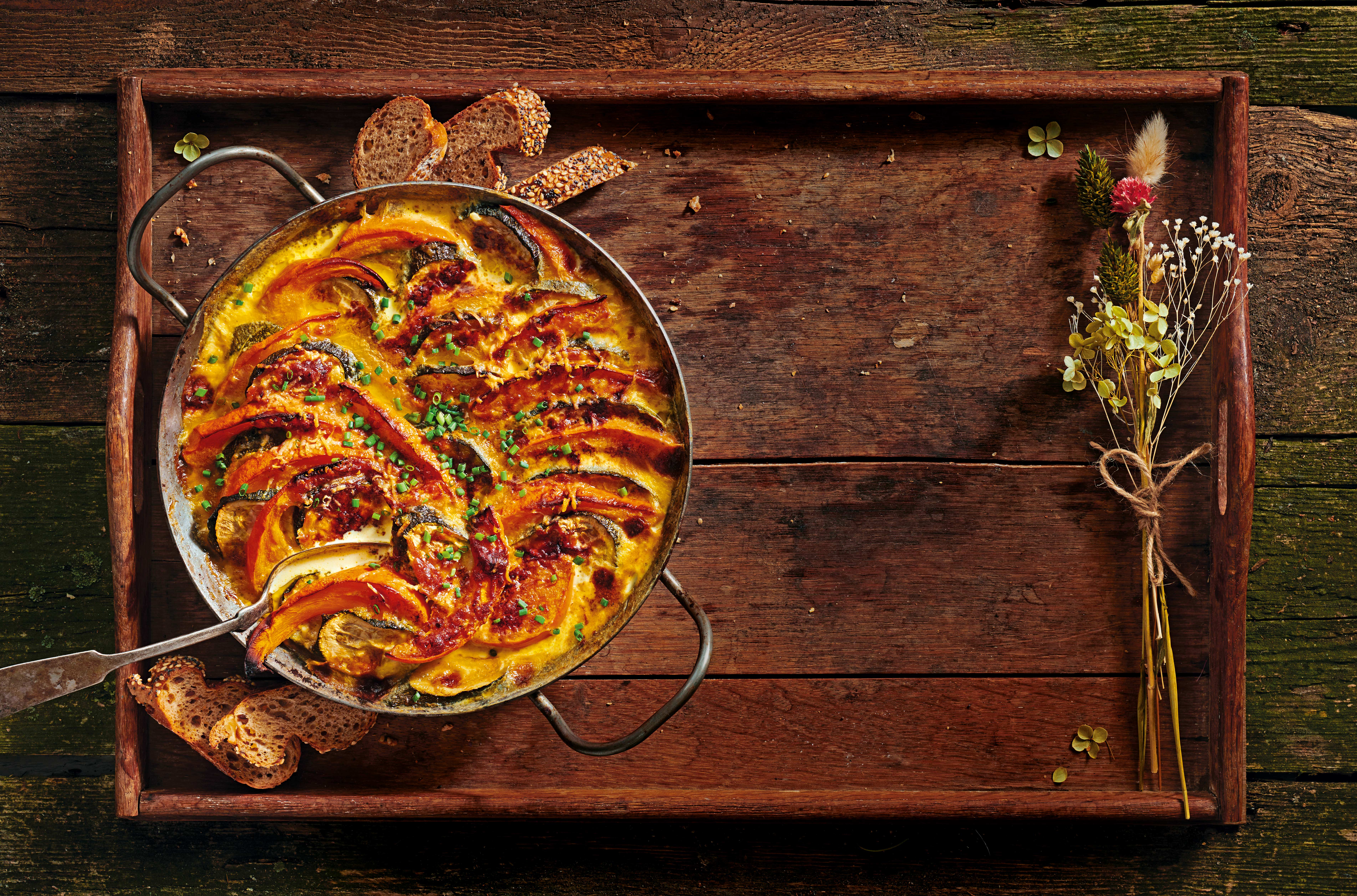 Knoblauch schälen und klein hacken. Kürbis und Zucchini in ca. 1 cm dicke Scheiben schneiden und die Form damit dachziegelartig auslegen.