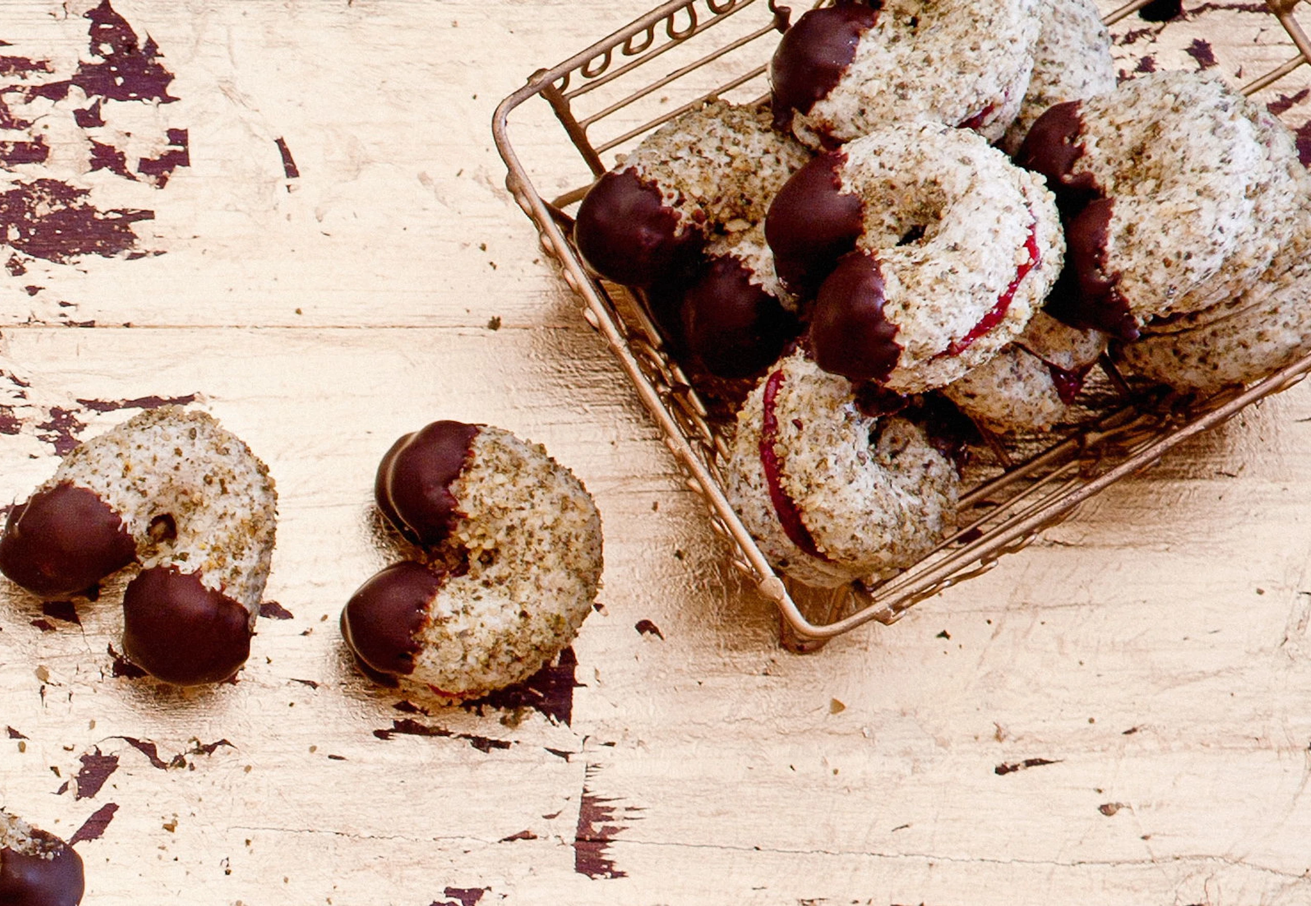 Kipferln aus dem Rohr nehmen, mitsamt dem Papier vom Backblech ziehen und auskühlen lassen. Je 2 Kipferln mit Marmelade zusammensetzen und in Schokolade tunken.