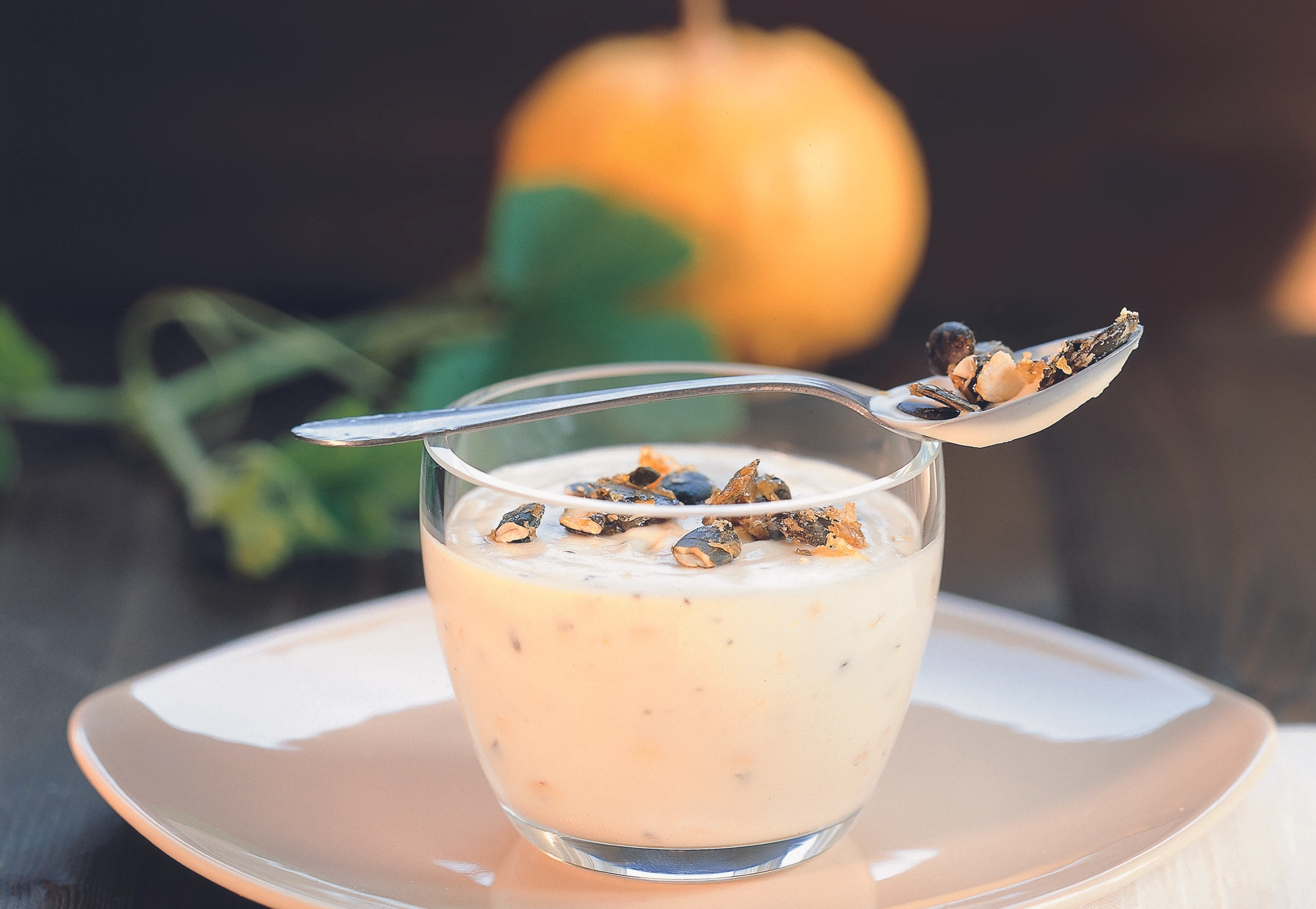Ca. 2 EL vom Kürbiskrokant für die Garnitur reservieren. Übrigen Krokant klein hacken.