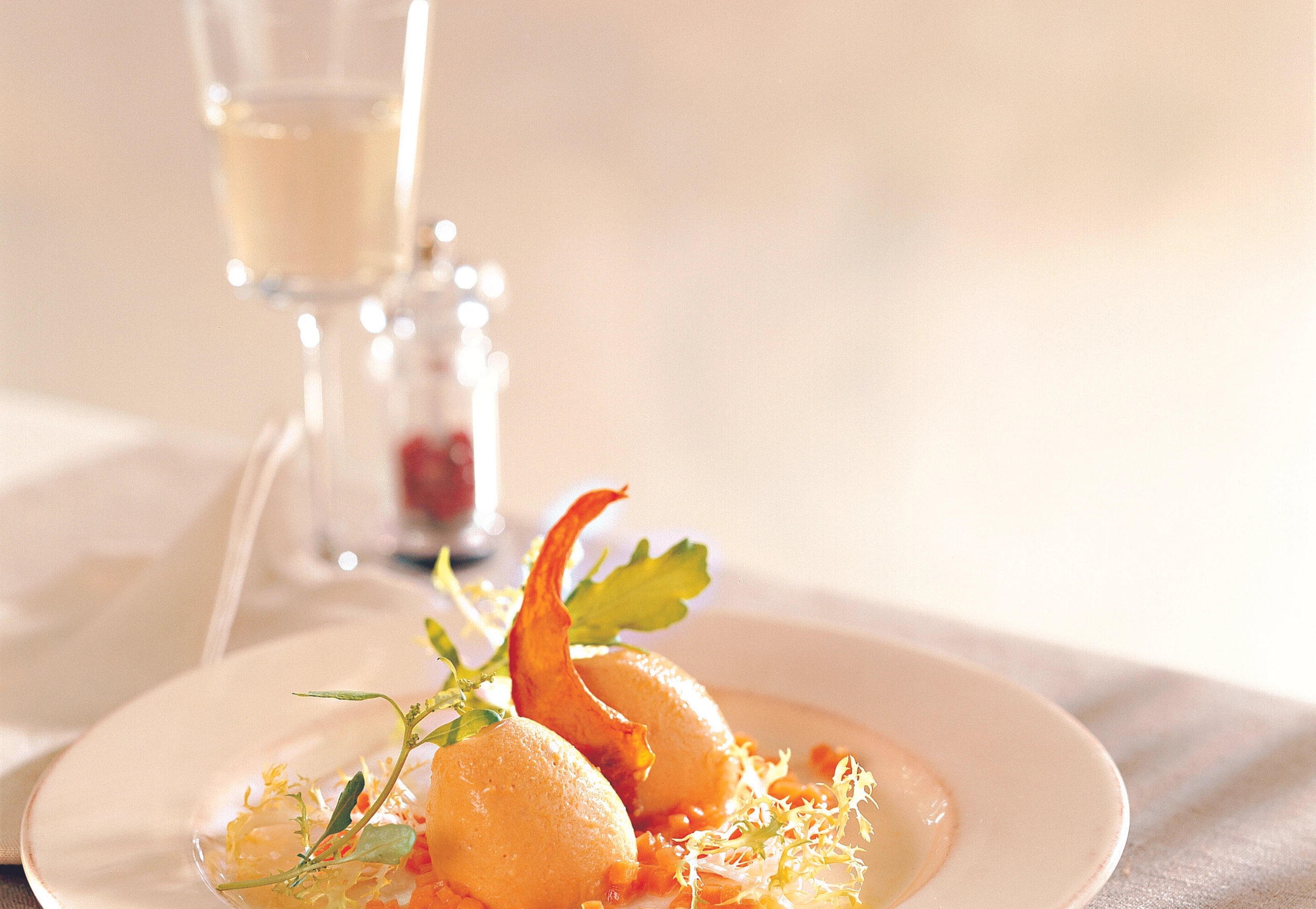 Für die Mousse Zwiebeln schälen und klein schneiden. Kürbis in 1 cm große Stücke schneiden. Kürbis und Zwiebeln im Öl anrösten. Wein zugießen, Kürbis zugedeckt weich dünsten, mit Salz, Pfeffer und wenig Kardamon würzen.