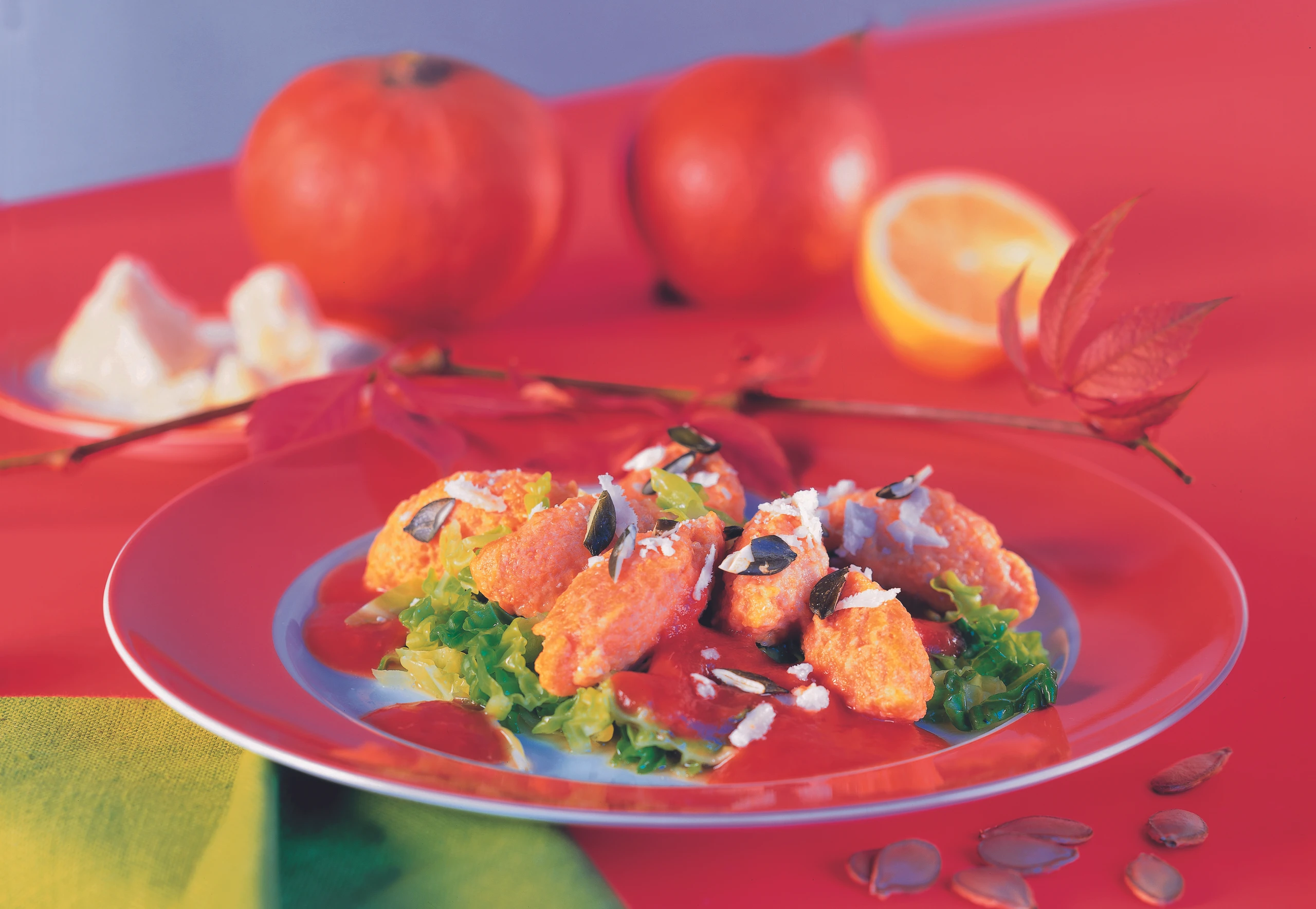 Mit einem Teelöffel Nockerl abstechen und in kochendes Salzwasser legen. Hitze reduzieren und die Nockerl ca. 5 Minuten ziehen lassen. Nockerl auf den Kohlstreifen anrichten, mit Parmesan bestreuen und eventuell mit Tomatensauce servieren.