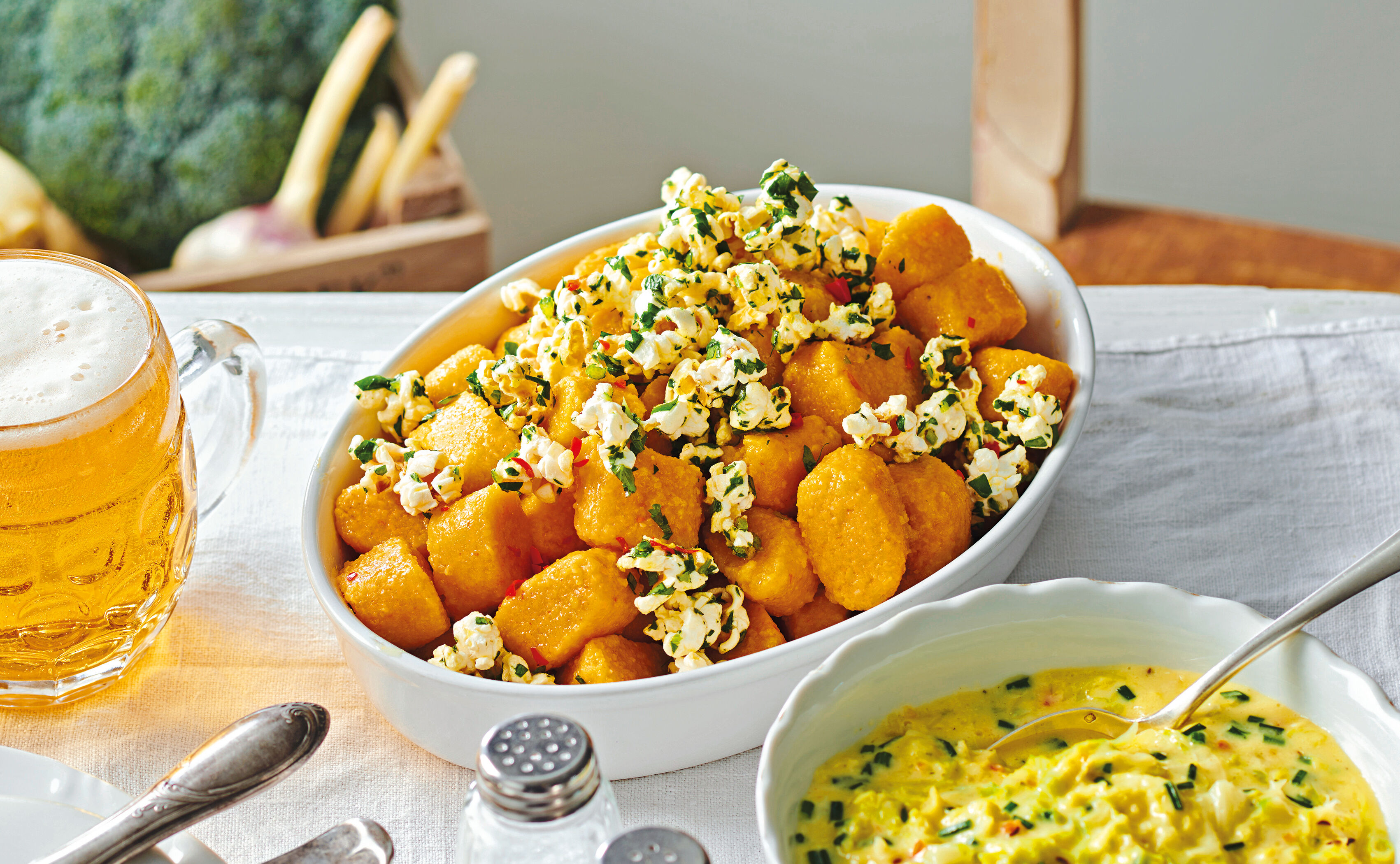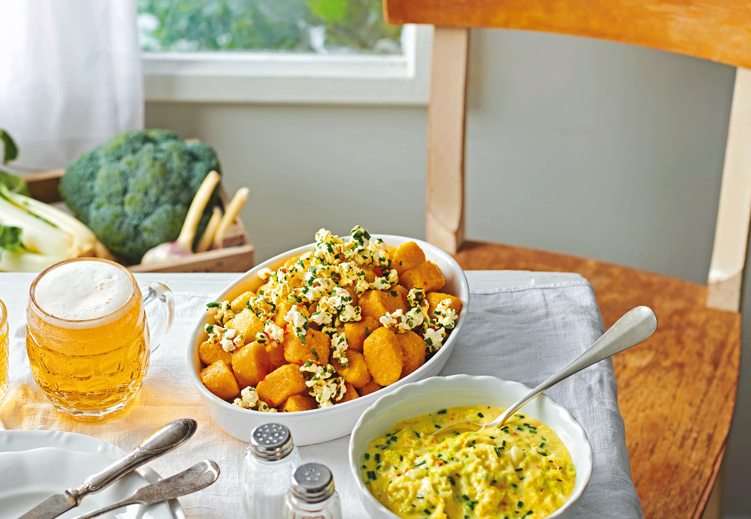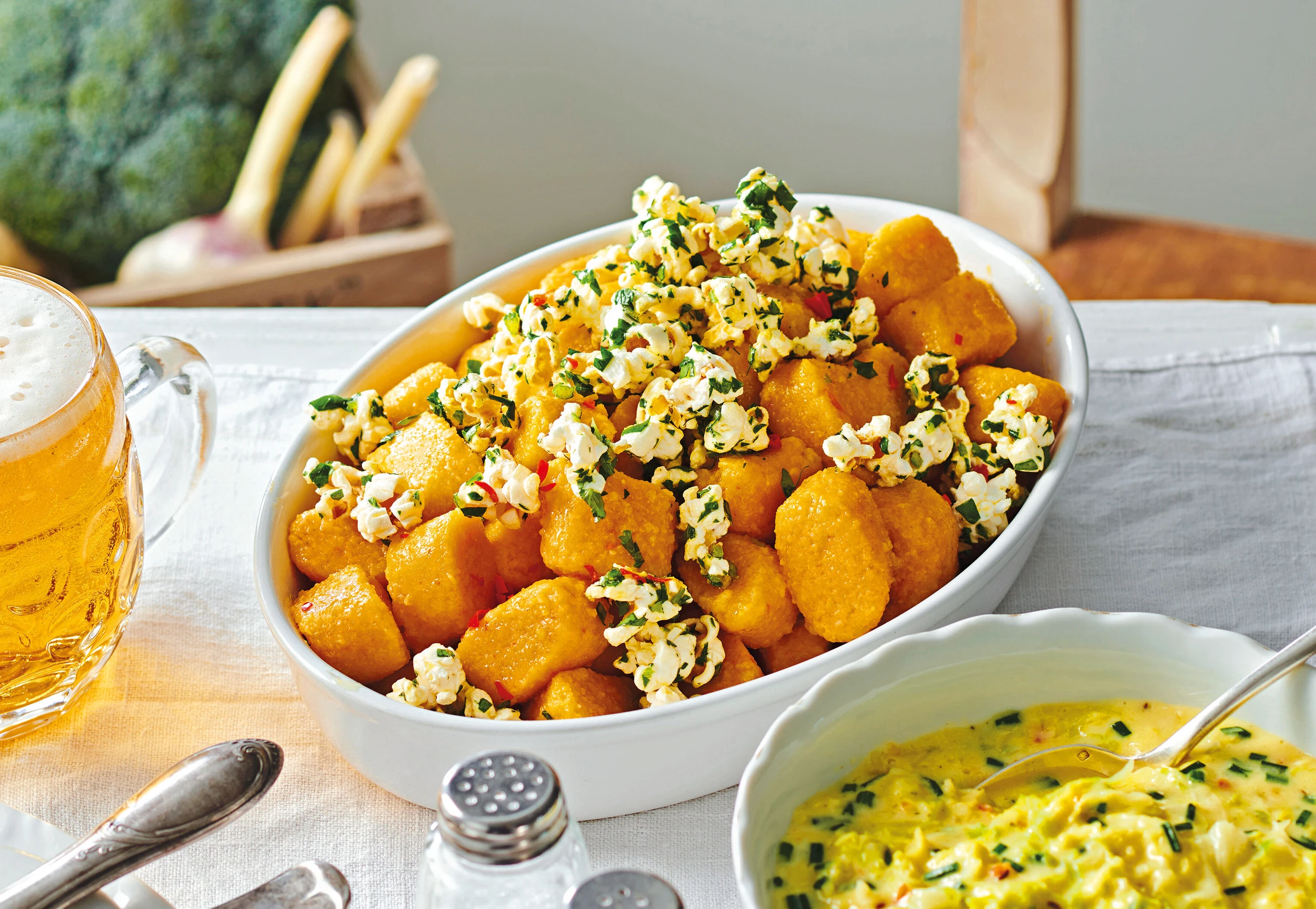 Kürbisnockerl mit Rahmkohl und Kräuter-Popcorn