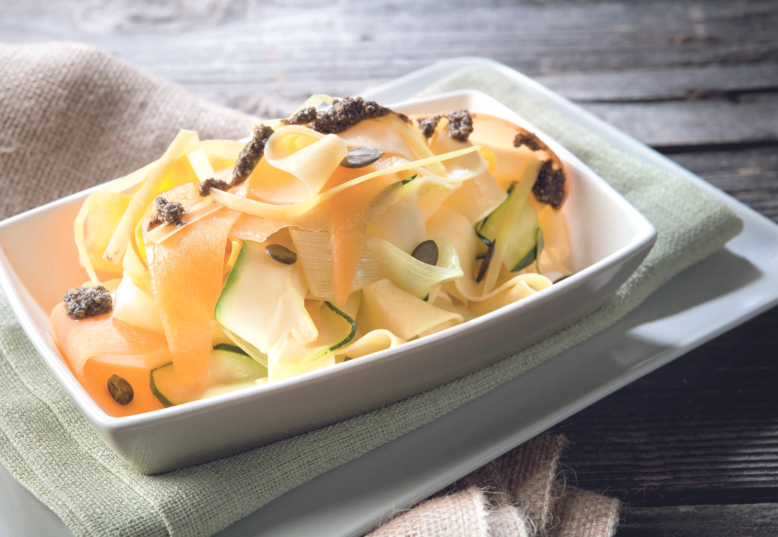 Kürbisnudeln mit Zucchini, Lauch und Kürbiskernpesto