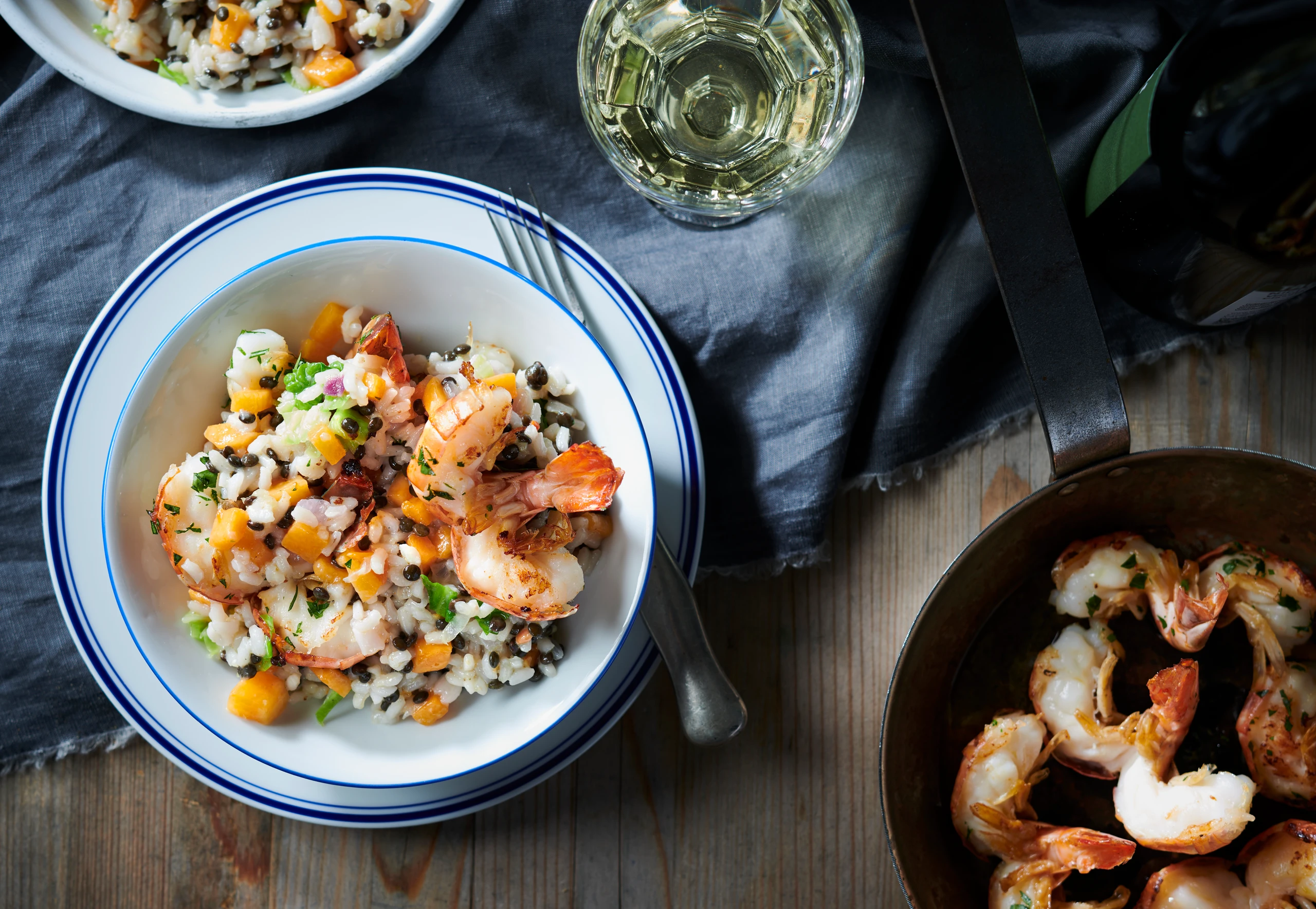 Kürbisrisotto mit Belugalinsen und Garnelen