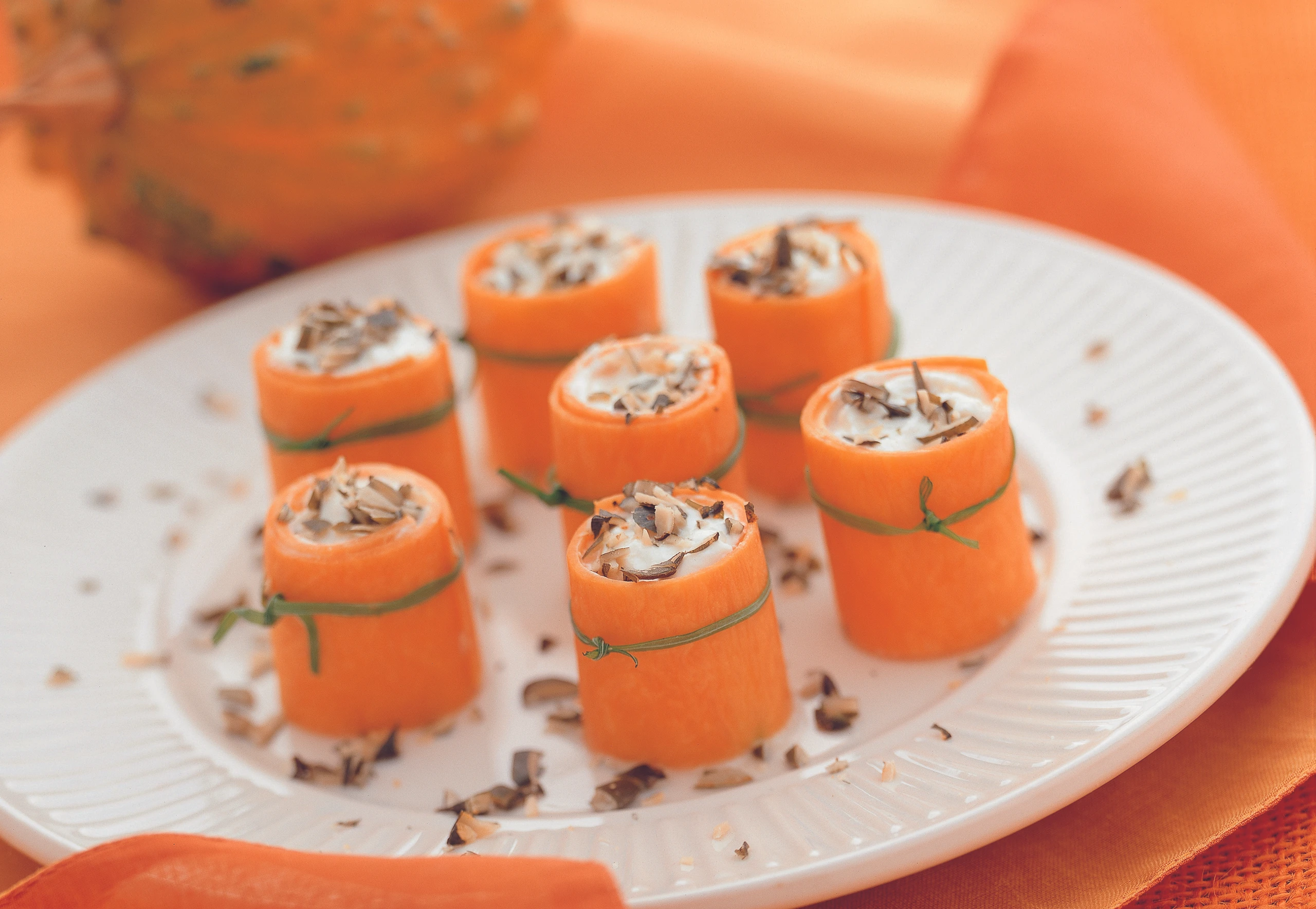 Vom Kürbis 1–2 mm dicke Scheiben (Brotschneidemaschine!) abschneiden. Aus den Scheiben 16 Streifen (5 x 15 cm) schneiden (dabei fällt die Schale weg) und nebeneinander auflegen. Jeden Kürbisstreifen am unteren Rand mit ein wenig von der Fülle bestreichen, über die Fülle eng einrollen und mit Schnittlauch binden.