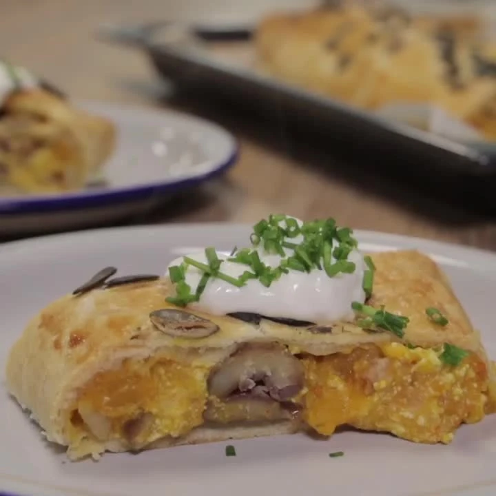 Strudel herausnehmen und mit Sauerrahm und Schnittlauch servieren.