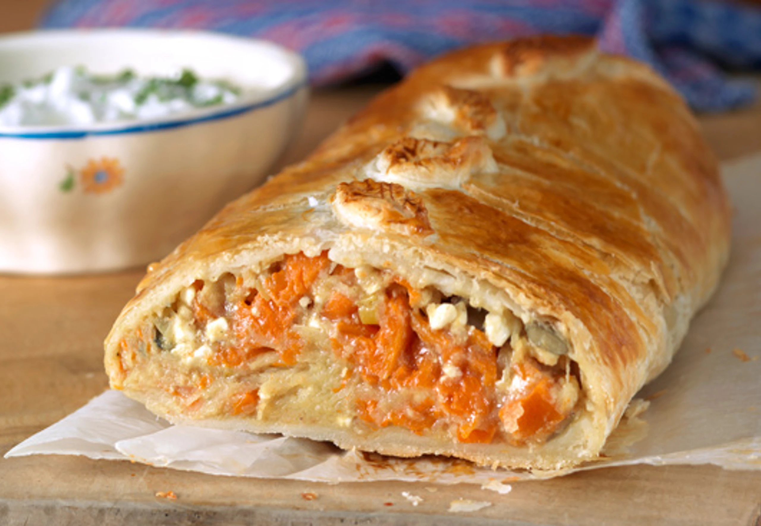 - Teig flach auflegen, zwei Drittel der Fläche mit Fülle belegen. Ränder mit verquirltem Ei bestreichen. Teig seitlich einschlagen und über die Fülle einrollen. Strudel auf das Blech legen, mit Ei bestreichen und im Rohr (mittlere Schiene) goldbraun backen (ca. 35 Minuten). Kürbisstrudel mit Kräuterrahm servieren.