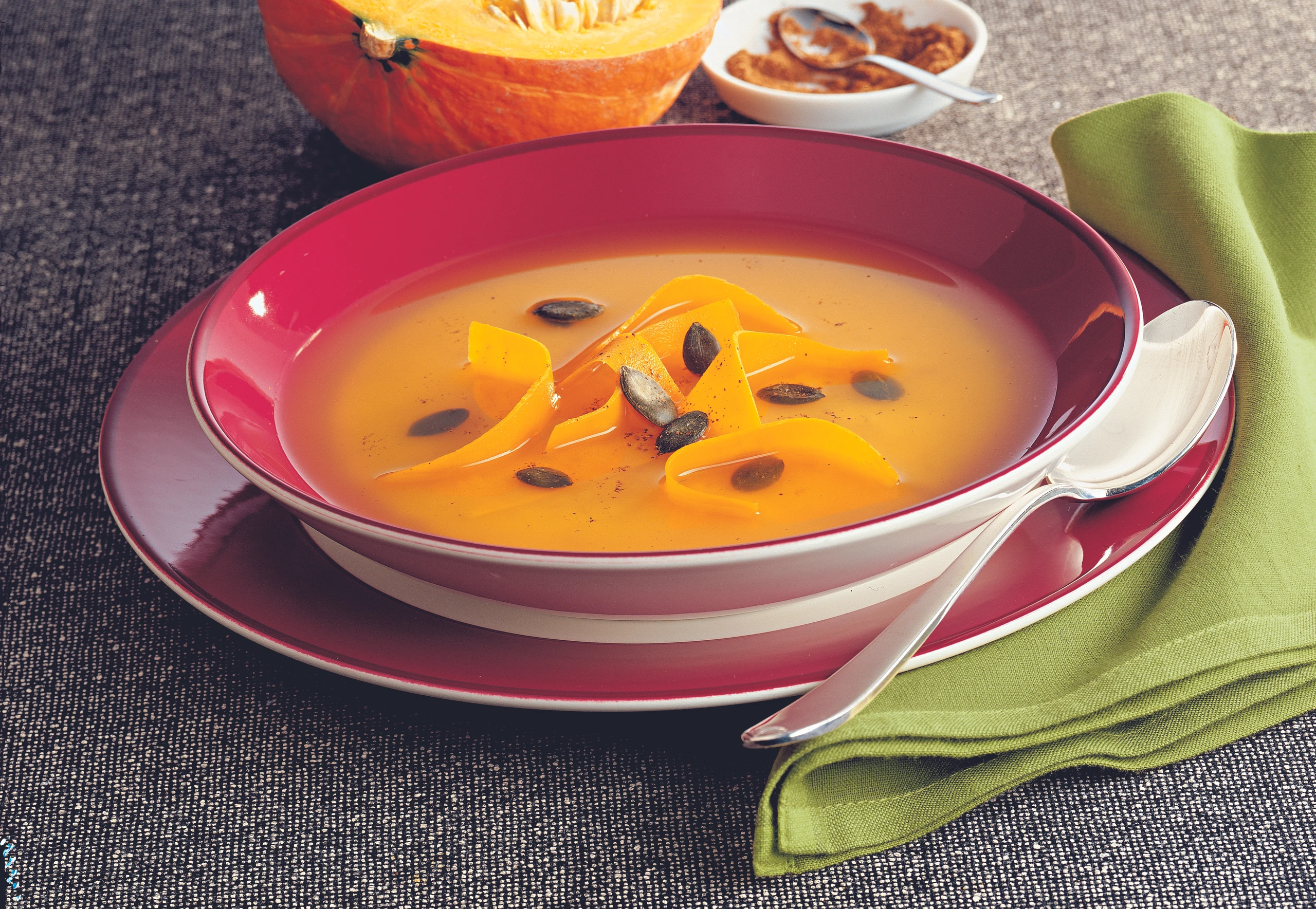 Parallel dazu Kürbisstreifen in Salzwasser bissfest kochen, abseihen und abtropfen lassen. Suppe mit den Kürbisstreifen anrichten und mit Kürbiskernen bestreuen.