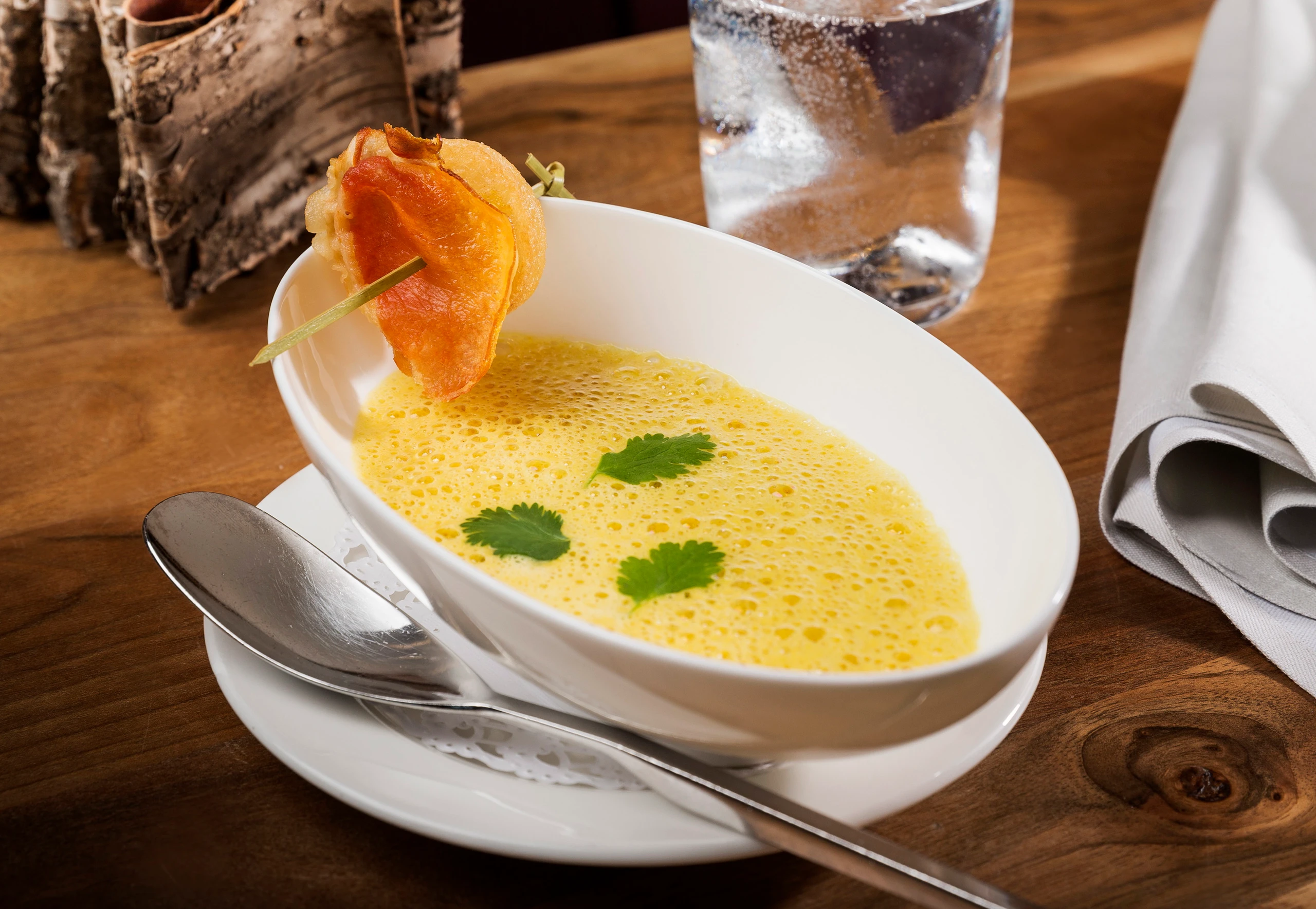Suppe aufkochen, mit dem Stabmixer aufschlagen, anrichten, mit Koriander und den Spießchen garniert servieren.
