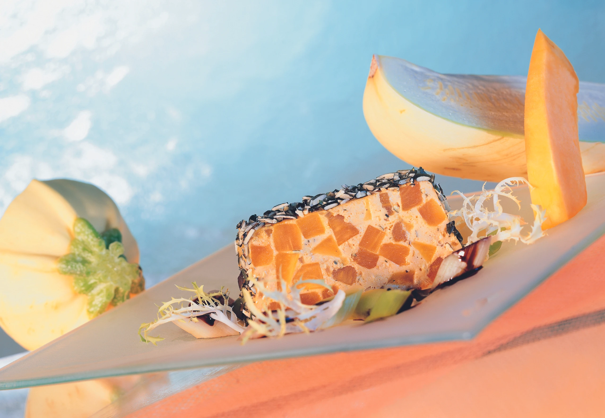Terrinenform mit Wasser ausspülen und mit Frischhaltefolie auslegen. Kürbis, Schalotten und Lauch schälen bzw. putzen und in kleine Stücke schneiden. Gemüse im Olivenöl anschwitzen, Suppe und Schlagobers zugießen, mit Salz und Pfeffer würzen. Gemüse weich dünsten, mit dem Stabmixer pürieren und auskühlen lassen.