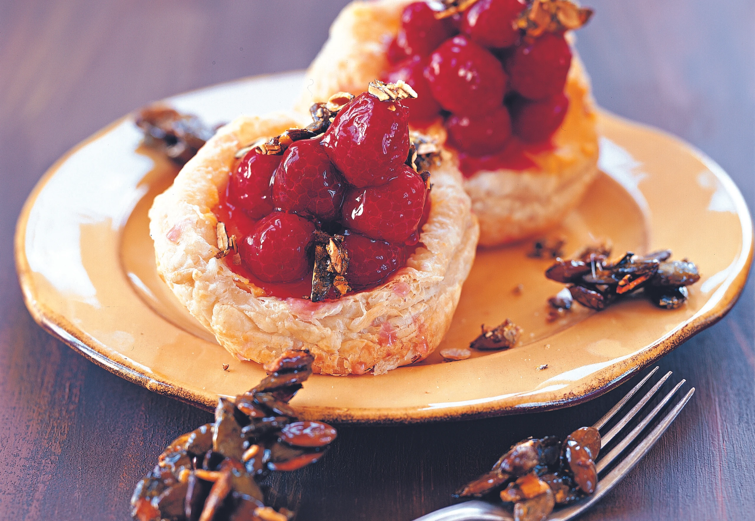 Kürbistörtchen mit den Himbeeren belegen. Tortengelee nach Packungsanleitung zubereiten und die Himbeeren damit überziehen. Kürbistörtchen mit Kürbiskrokant bestreut anrichten.
