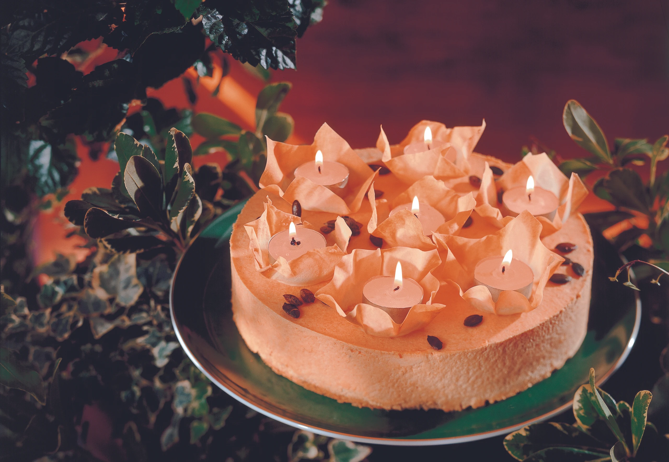 Torte mit einem Messer vom Formenrand lösen, die Springform öffnen und die Torte aus der Form heben. Mit Kürbiskernen und mit den Teigschüsserln garnieren (siehe Rezept). Vor dem Servieren die Teelichter in die Teigschüsserln setzen und anzünden.