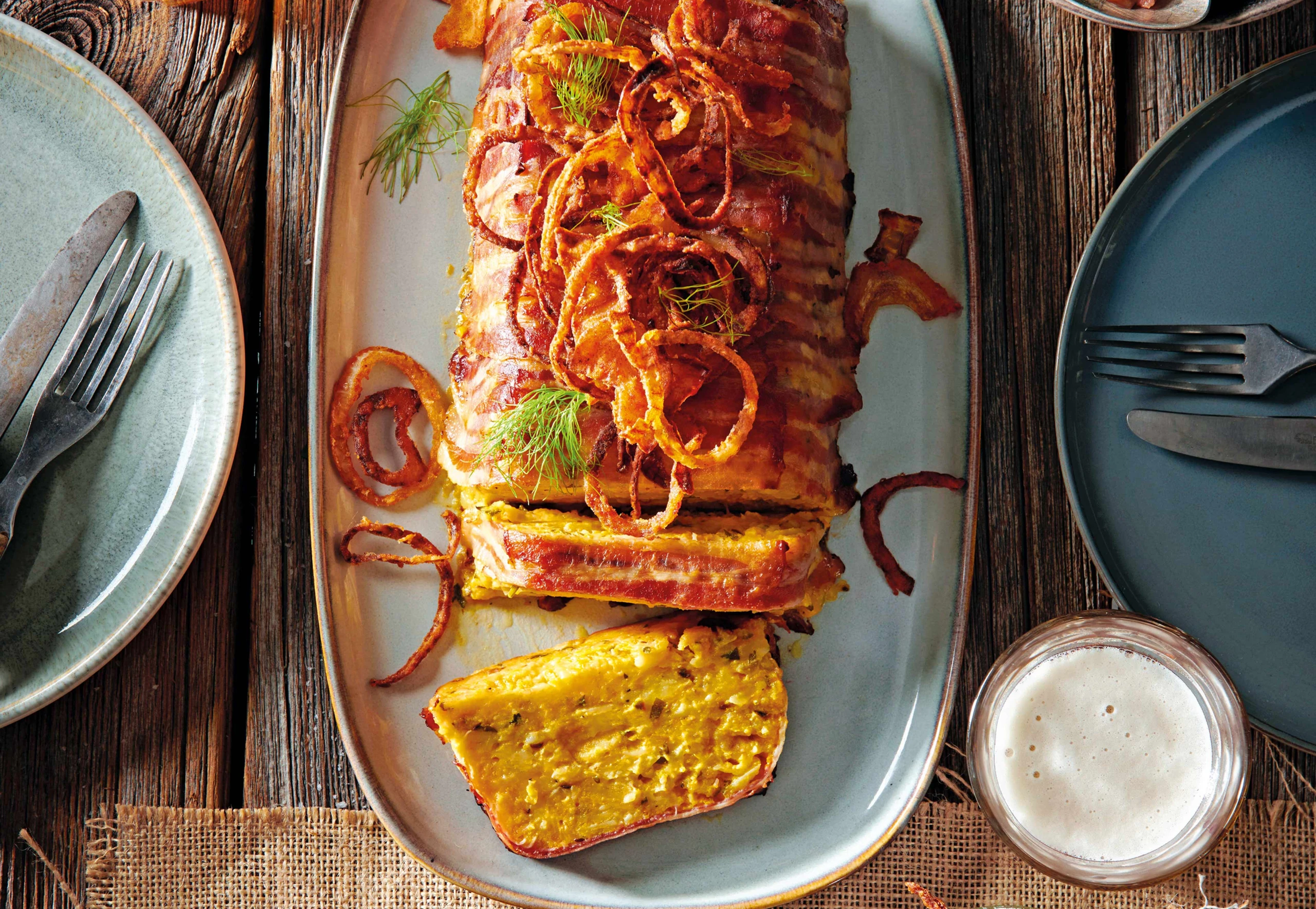 Kürbiswandl im Speckmantel mit Röstzwiebeln und Kohlsprossen