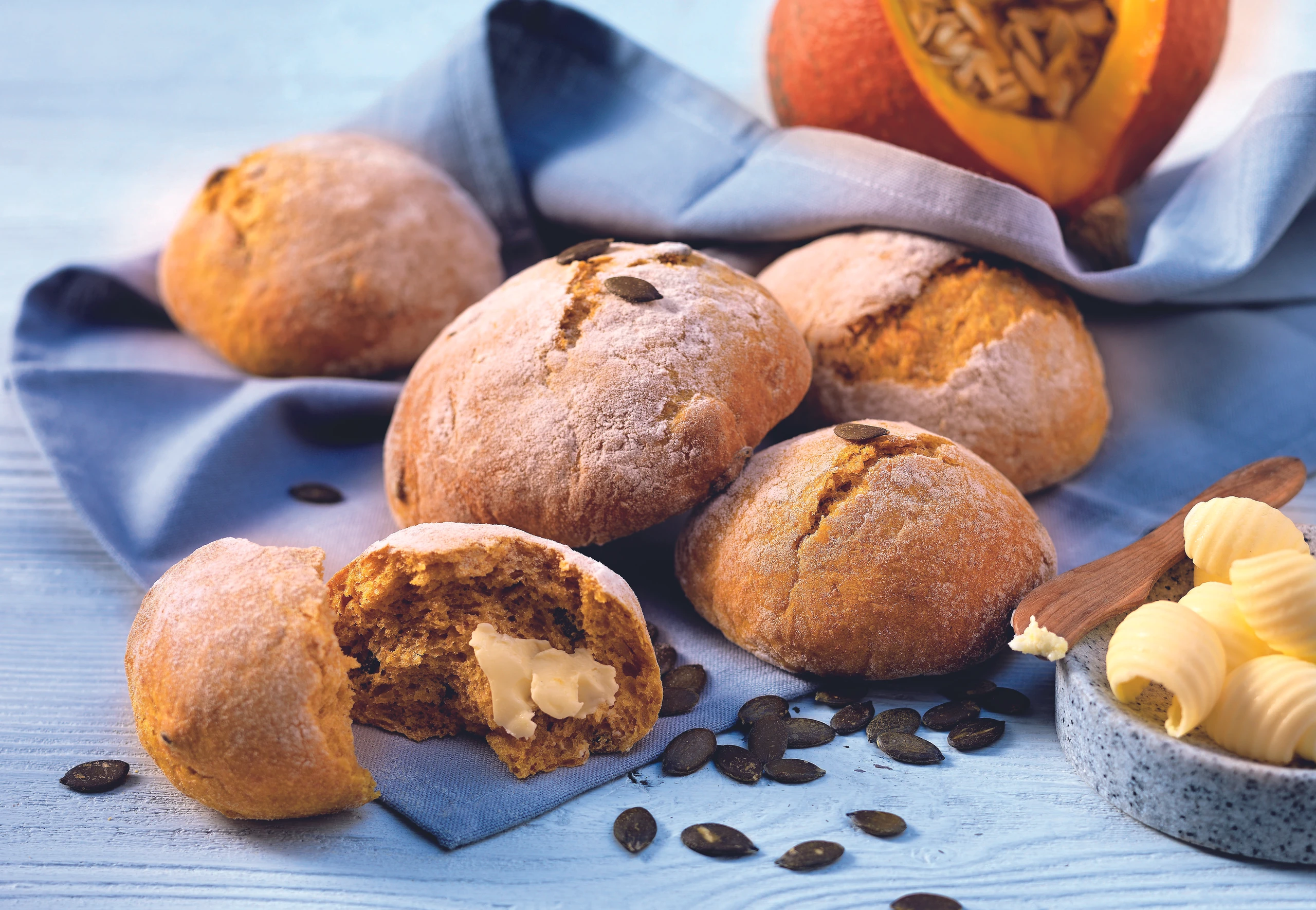 Kürbispüree mit dem Vorteig verrühren. Ingwerpulver, Salz sowie ein Drittel des Mehls einrühren. Restliches Mehl nach und nach unter-kneten. Zuletzt Öl und die Kürbiskerne einarbeiten und einen glatten Teig kneten.