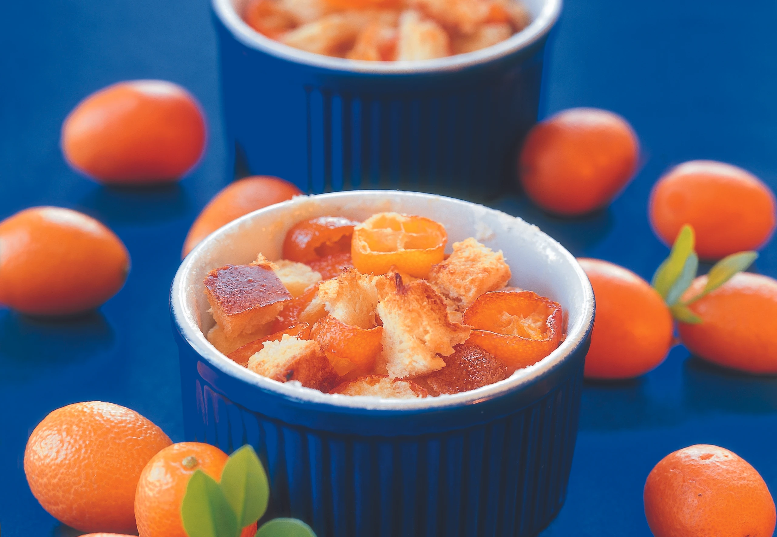 Brioche in kleine Würfel schneiden. Kokoscreme mit Kristallzucker vermischen und leicht erwärmen. Eier zugeben und alles gut vermischen. Briochewürfel und Kumquat-Dip unterheben.