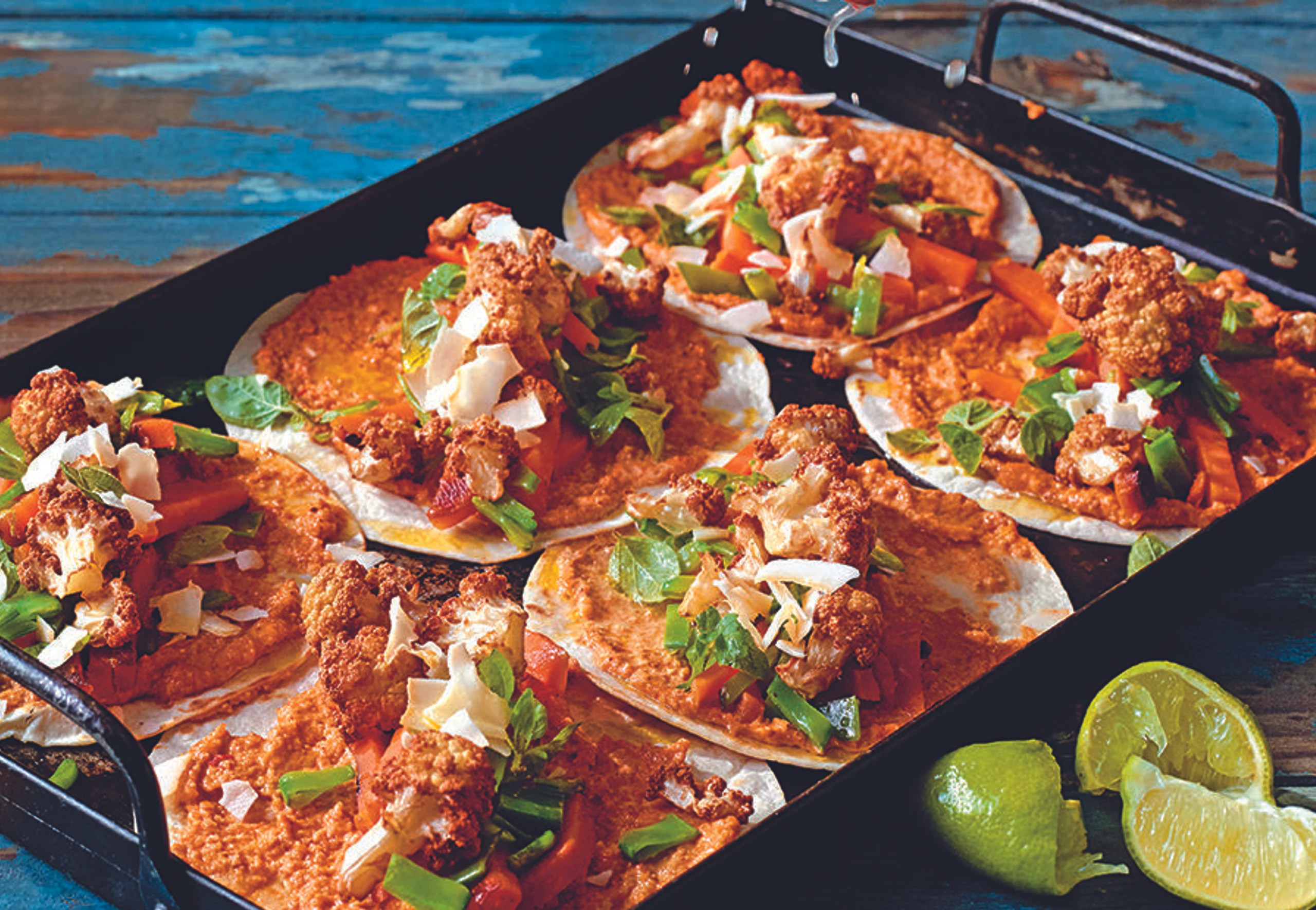 Tortillas laut Anweisung auf der Packung erwärmen, mit der Creme bestreichen und mit Kartoffeln, Karfiol und Schoten belegen. Mit Oregano und Kokosflocken bestreuen und mit Limettensaft beträufelt servieren.