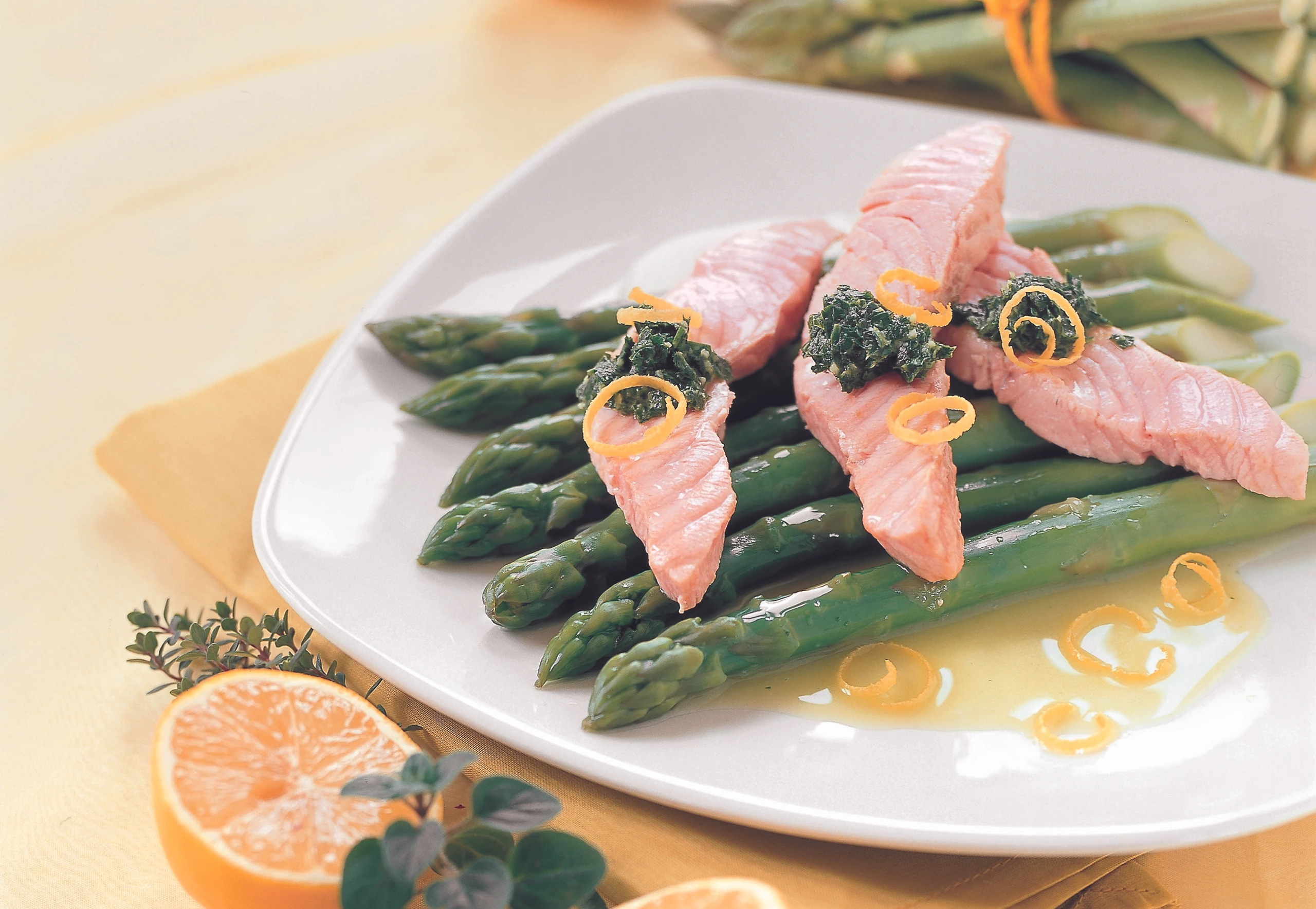 Lachsfilet aus der Marinade nehmen, abtropfen lassen und in einer beschichteten Pfanne auf beiden Seiten kurz braten. Lachsfilets salzen und mit Kräuterpesto auf dem Spargel anrichten. Dazu passen heurige Erdäpfel, fettfrei in Folie gebacken.