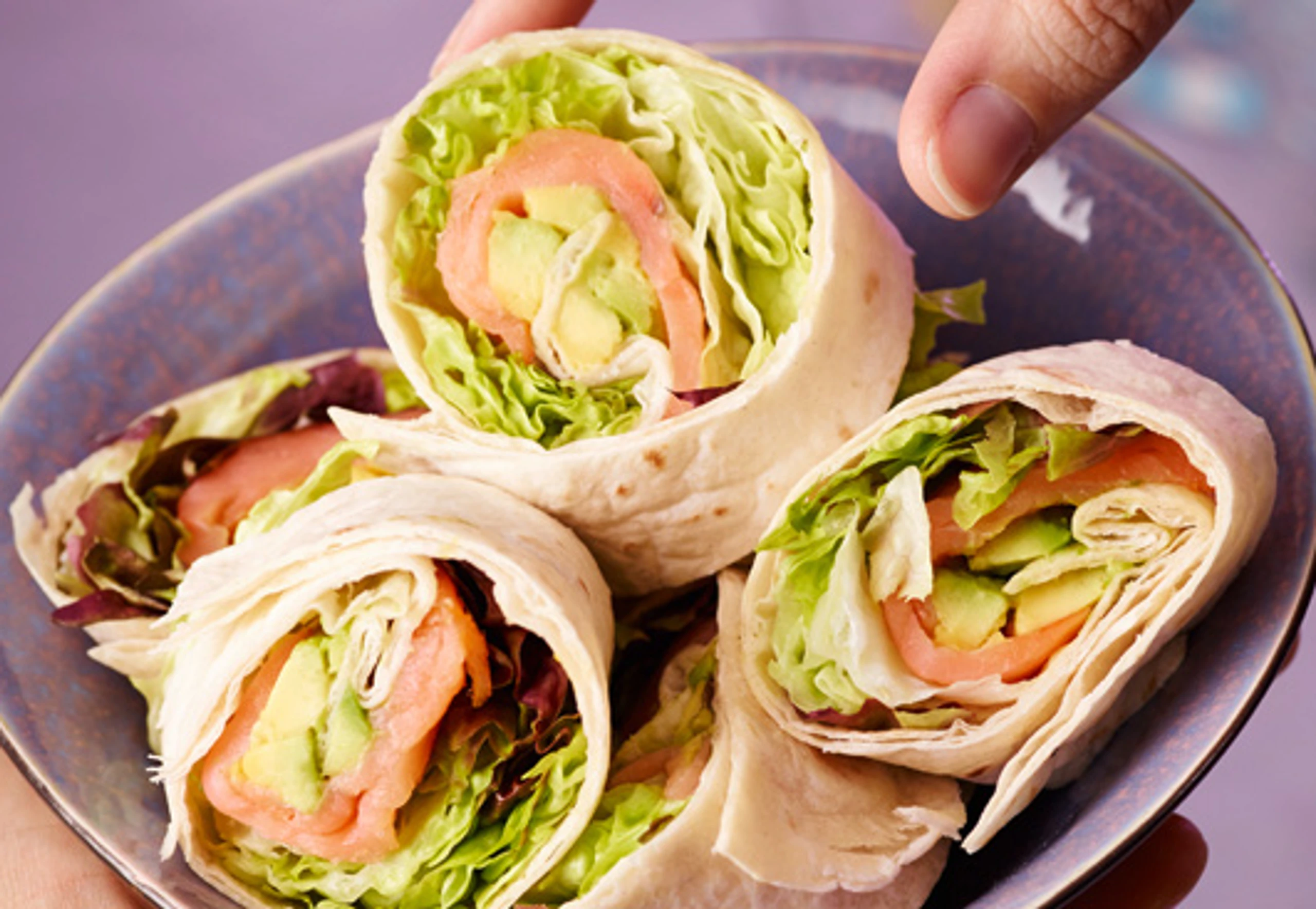 Tortillas auflegen, mit Salatblättern belegen, ca. 4 cm Rand frei lassen. Lachs- und Avocadoscheiben auf dem Salat verteilen. Rand einklappen, Tortillas möglichst straff einrollen. Mit einem scharfen Messer quer in ca. 3 cm breite Stücke schneiden.