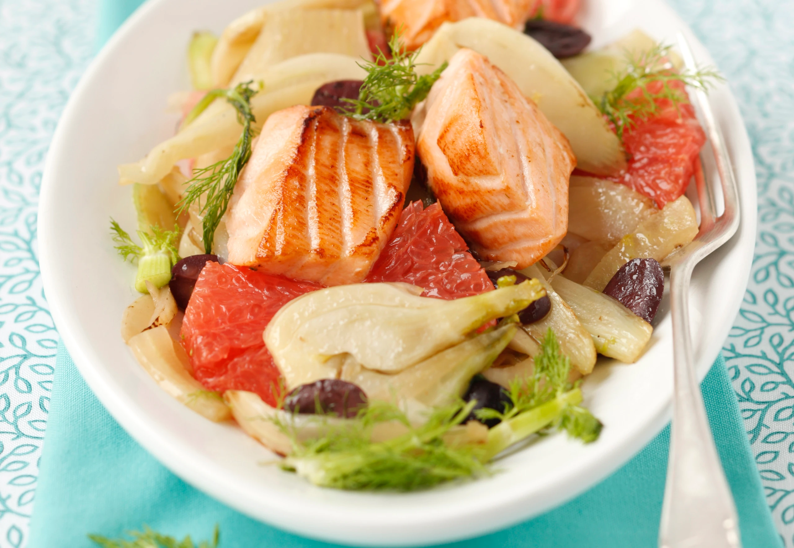 Im Bratrückstand Fenchel anschwitzen, mit Essig und Suppe ablöschen, mit Salz und Pfeffer würzen. Fenchel mit Oliven, Grapefruitscheiben und Fenchelgrün vermischen und kurz ziehen lassen. Gemüse mit dem Lachs anrichten und rasch servieren.