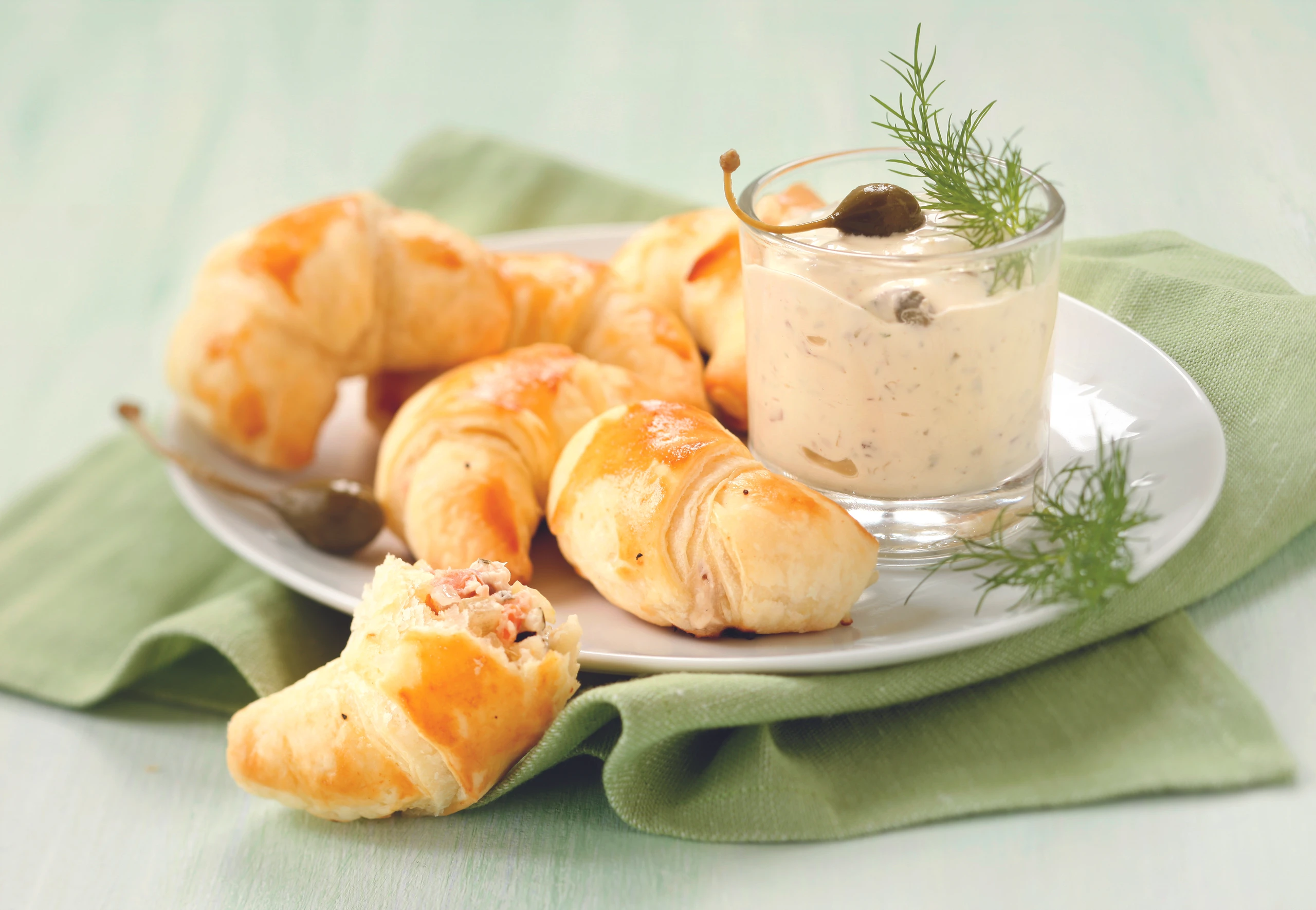 - Teigränder mit Ei bestreichen. Dreiecke mit Fülle belegen und einrollen (von der Grundlinie zur Spitze hin). Stangerln an den Enden verschließen und zu Kipferln formen. Kipferln mit Ei bestreichen, auf das Blech legen und im Rohr (mittlere Schiene) 20 Minuten backen. Kipferln herausnehmen und mit Sauce servieren.