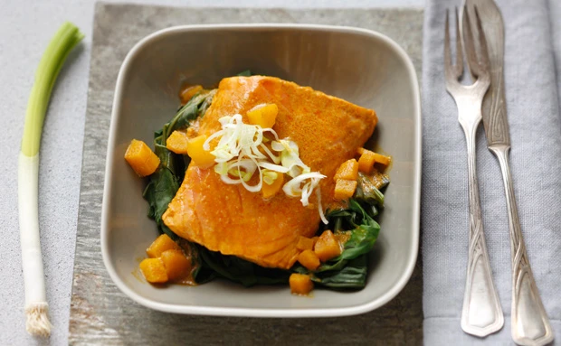 Lachs in Currysauce auf Spinat