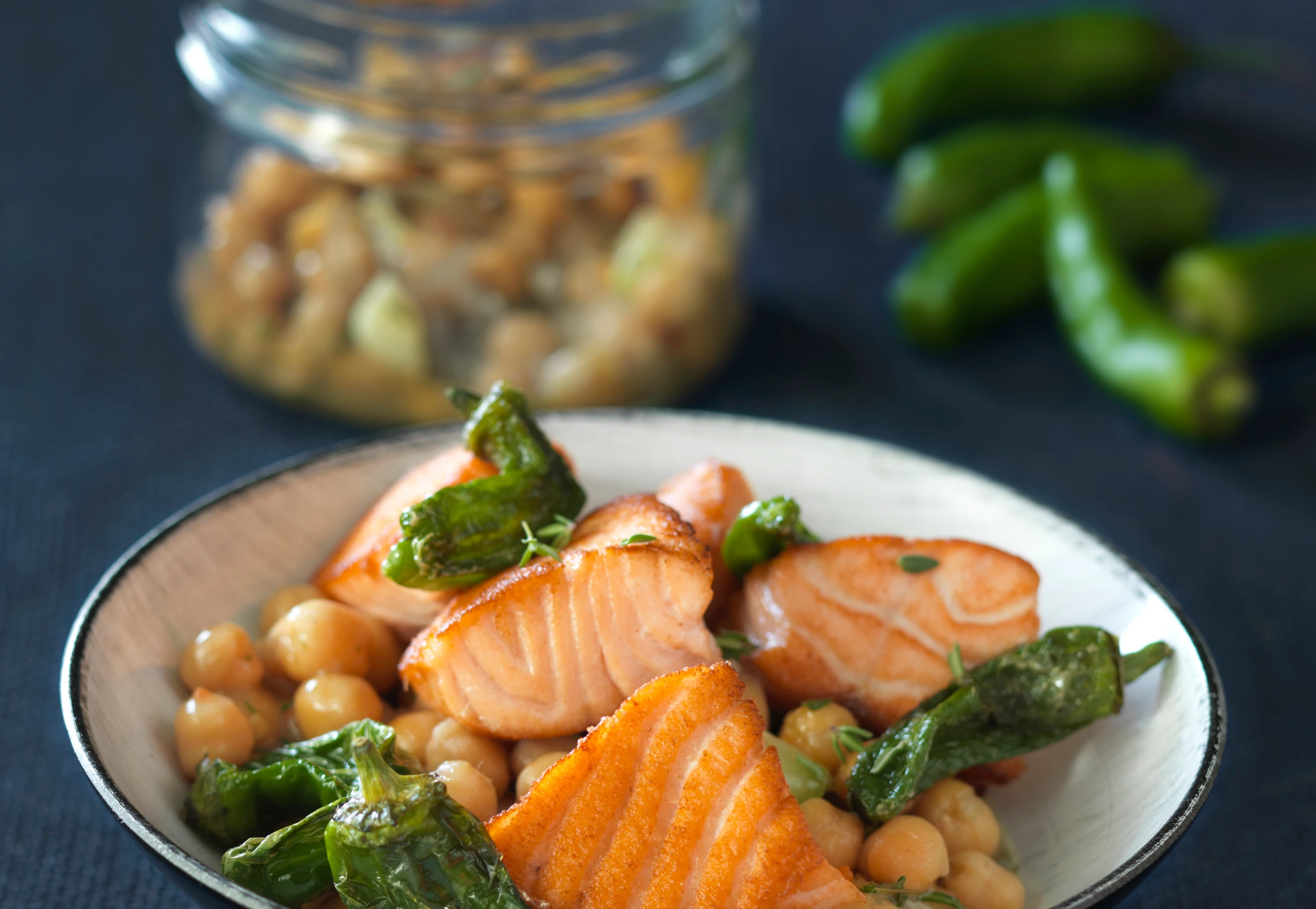 Im Bratrückstand Knoblauch und Sardellen anbraten und mit Suppe aufgießen. 1 TL Stärke mit 2 TL Wasser verrühren. Stärkemischung und Kichererbsen untermischen, Gemüse ca. 2 Minuten köcheln und mit Salz, Pfeffer, Thymian und Zitronensaft abschmecken. Lachs mit Kichererbsen und Paprika anrichten.