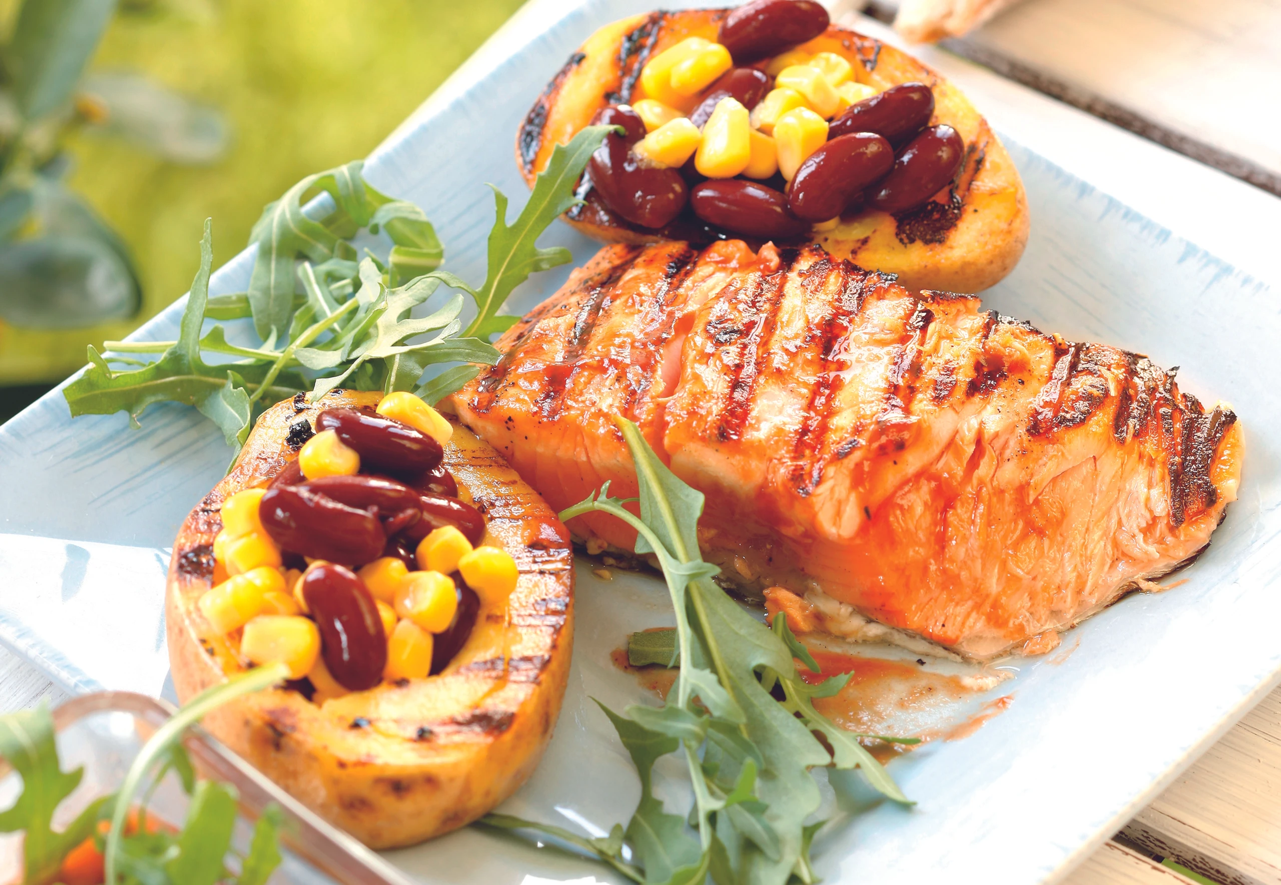 Lachs mit BBQ-Marinade und Feuer-Bohnen-Erdäpfeln