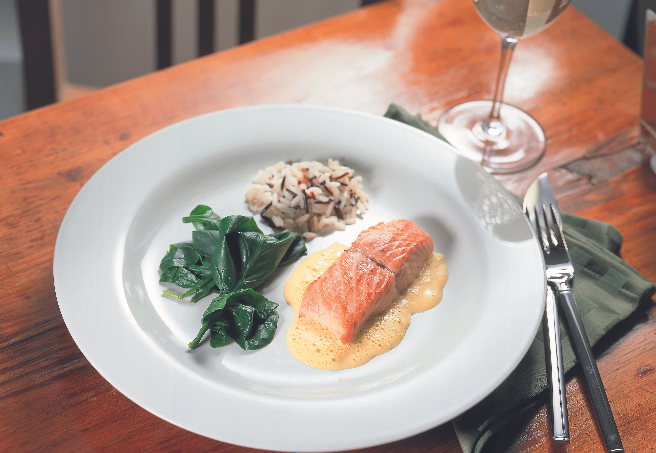 - Parallel dazu Sauce aufkochen und mit einem Stabmixer aufschlagen. Übrige Butter aufschäumen, Spinat darin schwenken und mit wenig Salz, Pfeffer und Muskatnuss würzen. Lachsfilets mit Spinat, Sauce und dem Reis anrichten.