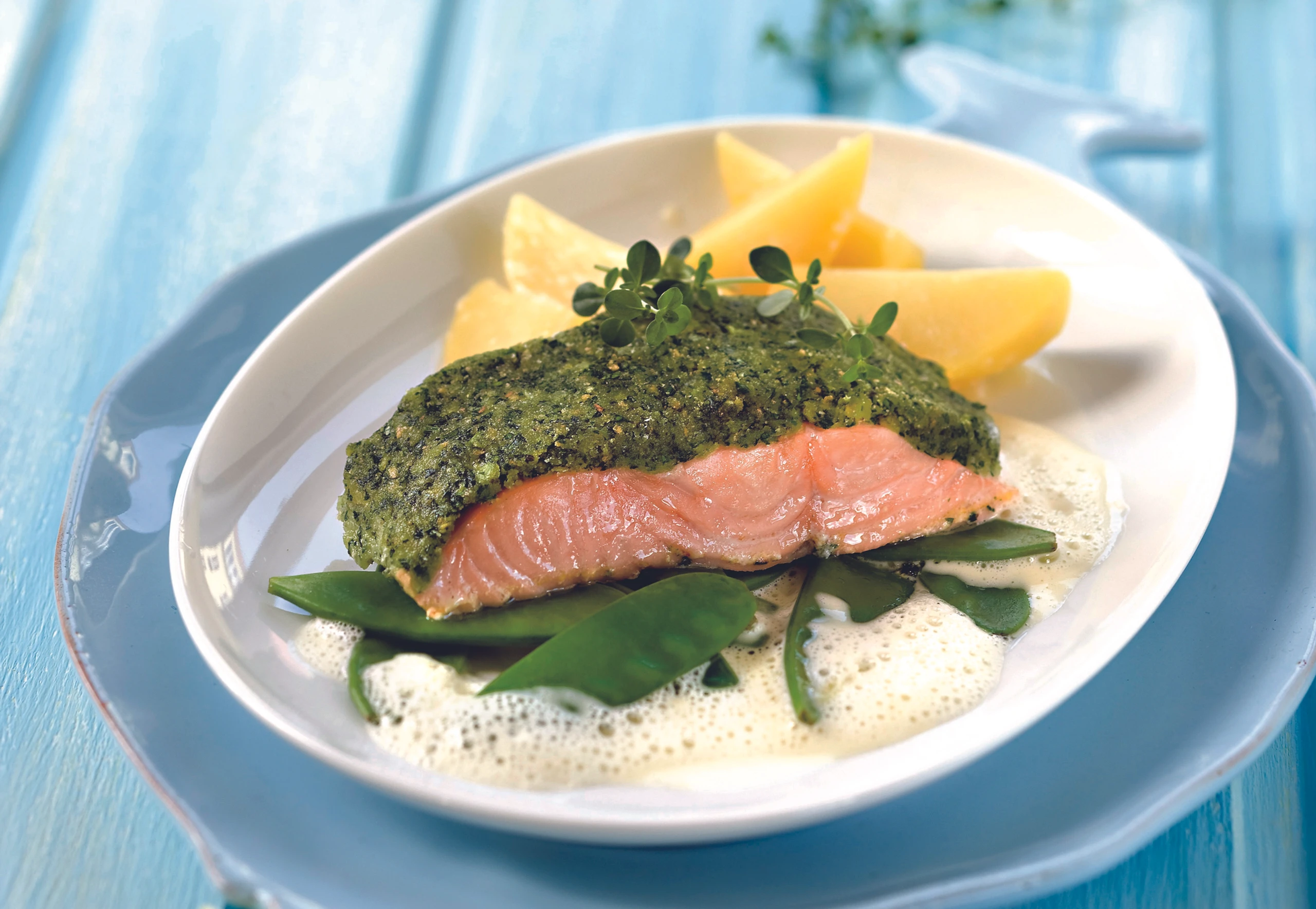 Lachs mit Kräuterhaube und buttrigen Erdäpfeln
