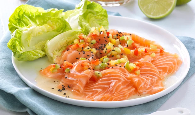 - Lachsfilet in dünnen Scheiben von der Haut schneiden. 2 gekühlte Teller mit wenig von der Marinade bestreichen. Fischscheiben darauf anrichten, salzen und pfeffern. Salat mit 2 EL von der Marinade vermischen.