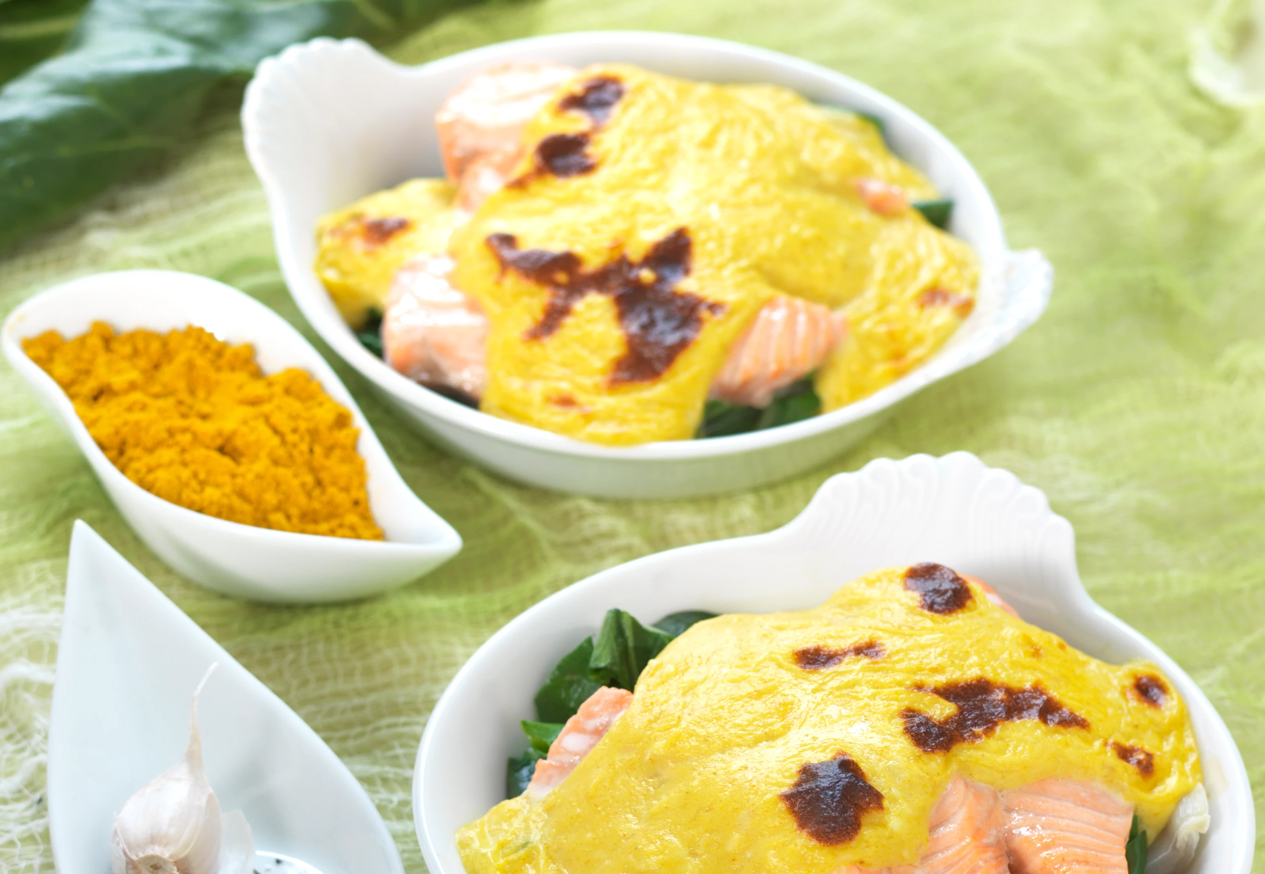 - Rohr auf 200°C vorheizen. Mangold in Portions-Auflaufformen verteilen, Lachs darauf legen, salzen und mit der Sauce überziehen. Im Rohr (obere Schiene / Gitterrost) 5 Minuten überbacken.