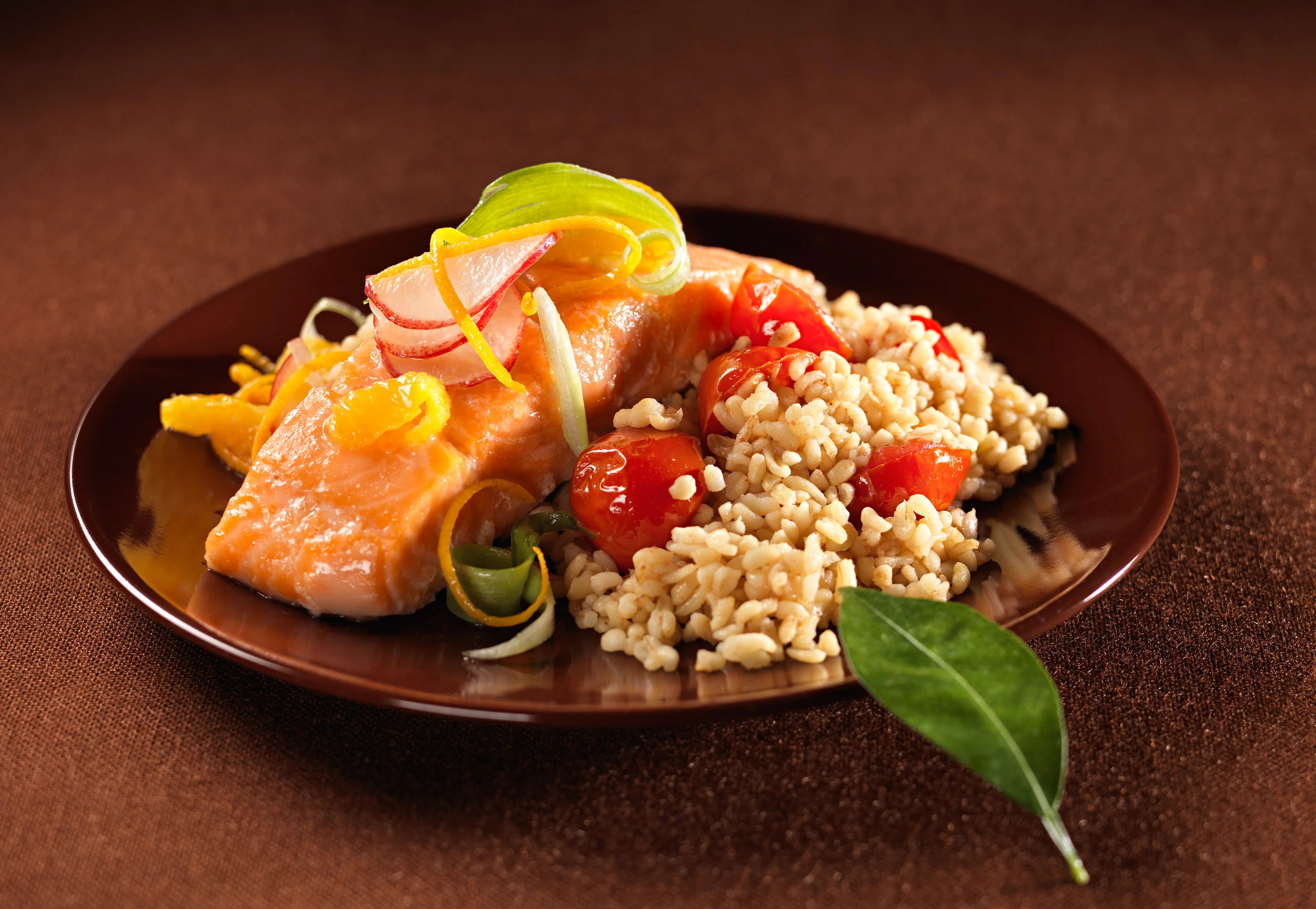 Lachsfilets aus dem Rohr nehmen, mit Orangen, Radieschen, Jungzwiebeln und Bulgursalat servieren.