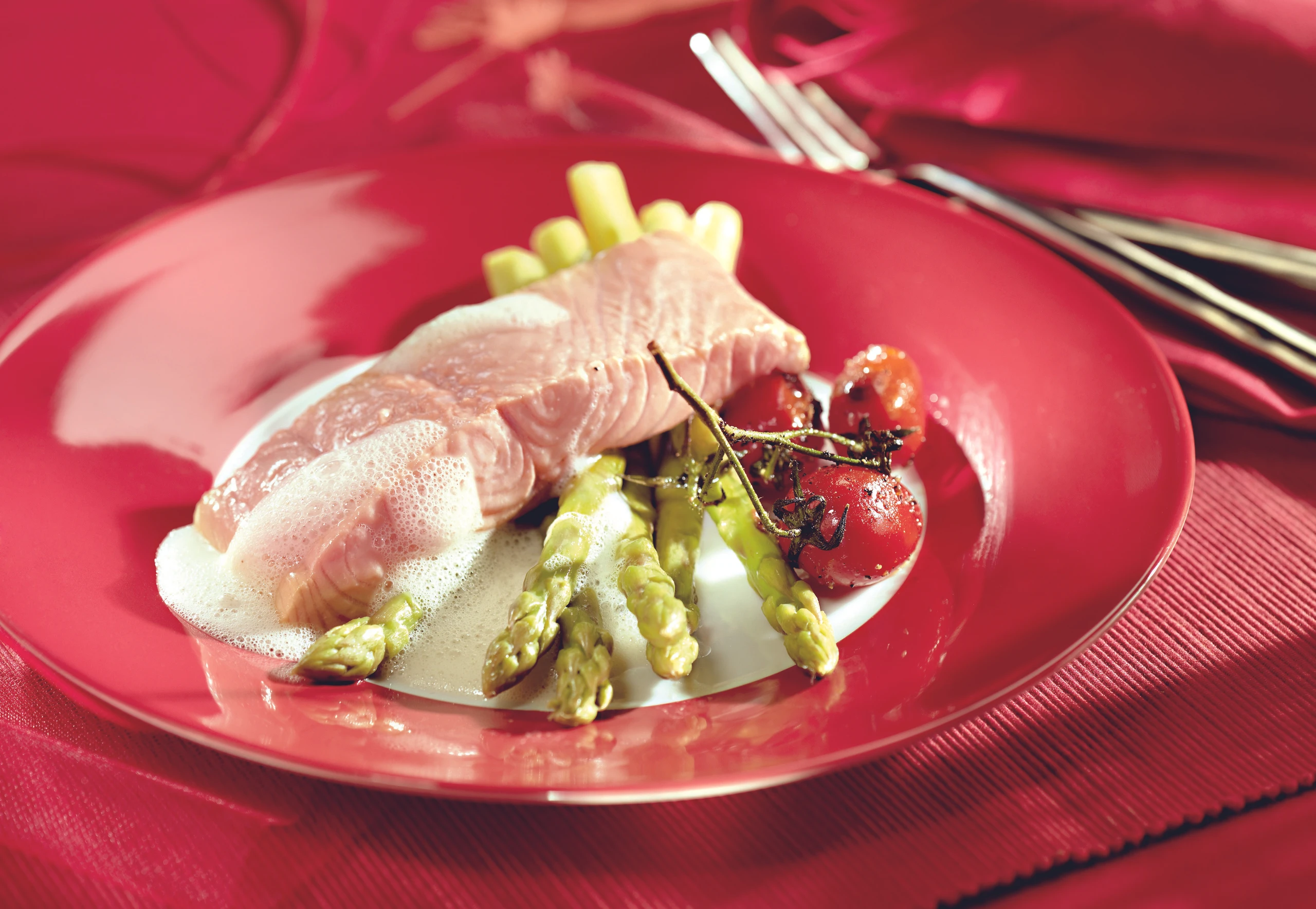 - Übrigen Fischfond aufkochen. Rohr auf 50°C vorheizen. Paradeiser in 2 EL Öl scharf anbraten und warm stellen. Lachsfilets in den Fond legen und unter dem Siedepunkt gar ziehen lassen (ca. 3 Minuten). Lachs herausheben und warm stellen. Spargel im Fond erwärmen. Sauce mit dem Stabmixer aufschlagen. Lachsfilets mit Spargel, Paradeisern und Sauce anrichten.